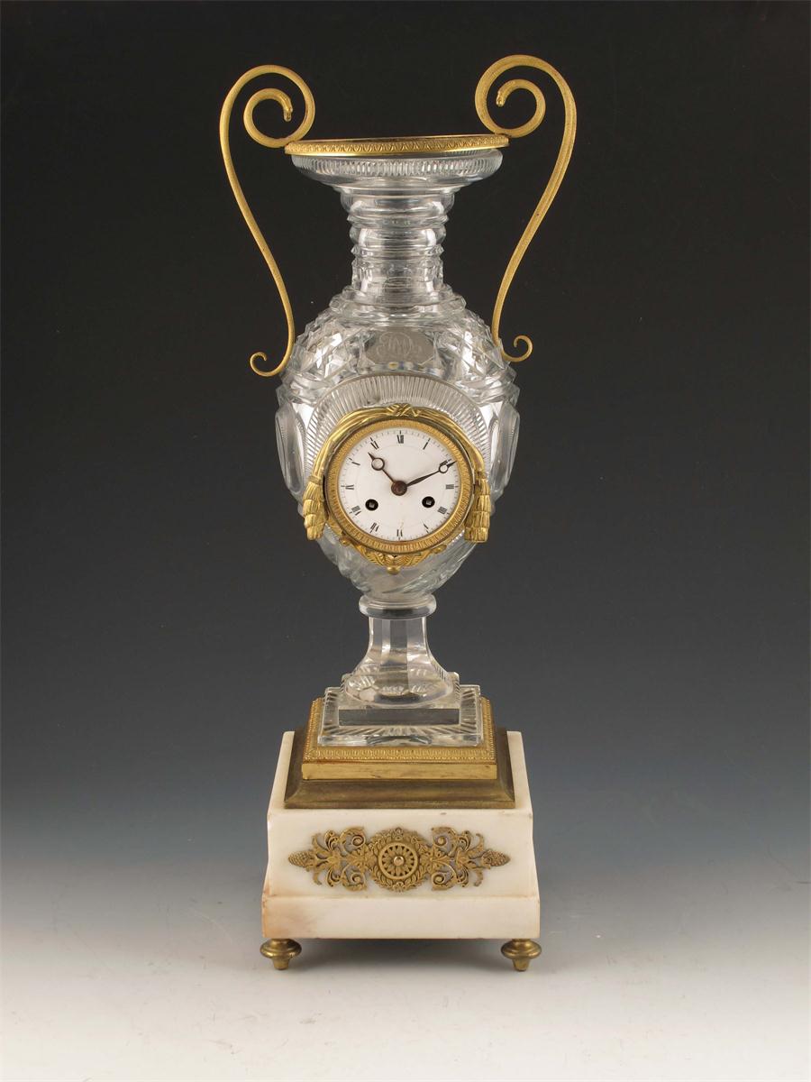 A 19th century French cut glass vase clock, with a later platform cylinder escapement striking on a bell with an enamel dial, with an ormolu drape and leaf bezel, set within a glass vase initialled DM, a cast leaf rim with twin serpent scroll handles, on a white marble and mounted base, 22in (56cm) h.
