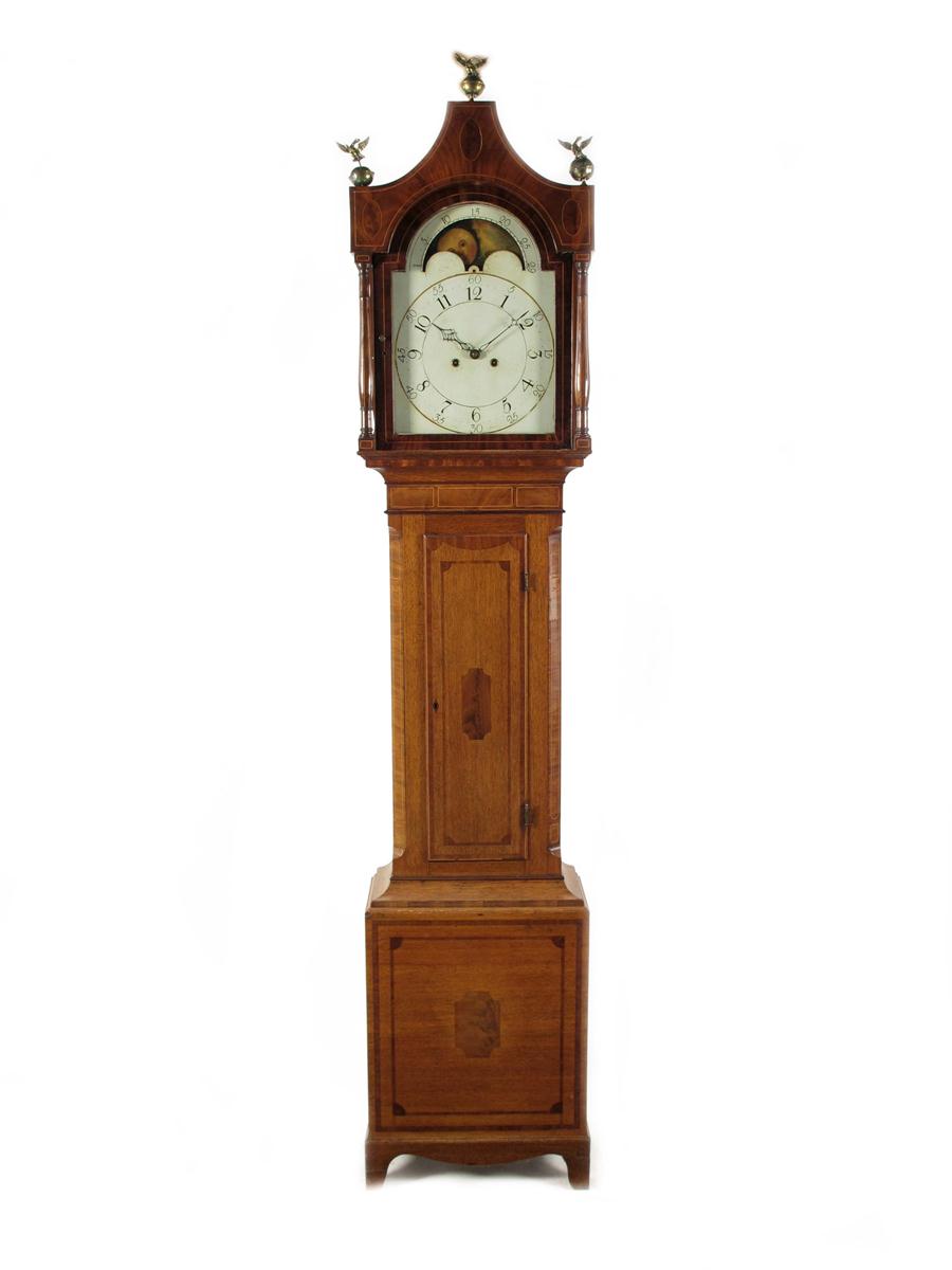 An early 19th century oak and mahogany longcase clock, with an 8 day movement striking on a bell to a painted 13 inch arched dial with moon phase, painted a tower and shipping, chapter ring inscribed WOOD, GRANTHAM, the case with inlaid stringing and three globe and eagle finials, 94in (239cm) h.