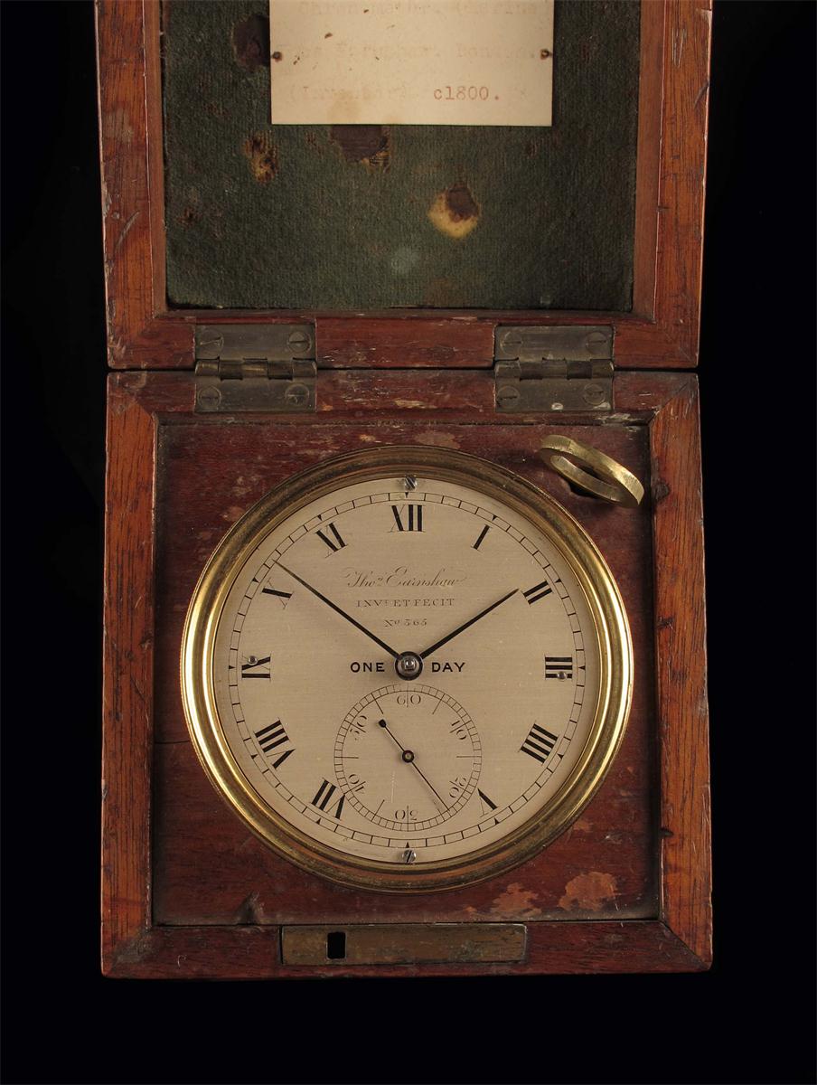 Thomas Earnshaw No.365/2536. A one day marine chronometer, the 3 inch silvered dial signed Thos. Earnshaw, INVT ET FECIT, No 365, ONE DAY; subsidiary seconds, plain blued steel hands, Roman numerals, the 4 pillar movement signed Thos. Earnshaw, Invt et fecit, No 365, London 2536; Earnshaw type escapement with spring detent, bimetallic Z balance with brass compensation weights, blued steel helical spring, in typical Earnshaw brass bowl with skirt counterweight; (gimbal and brass locking arms lacking) circa 1805, in a later associated mahogany box with re-engraved ivory plaque Earnshaw 365 Deckwatch, box 5in. (12cm) square.