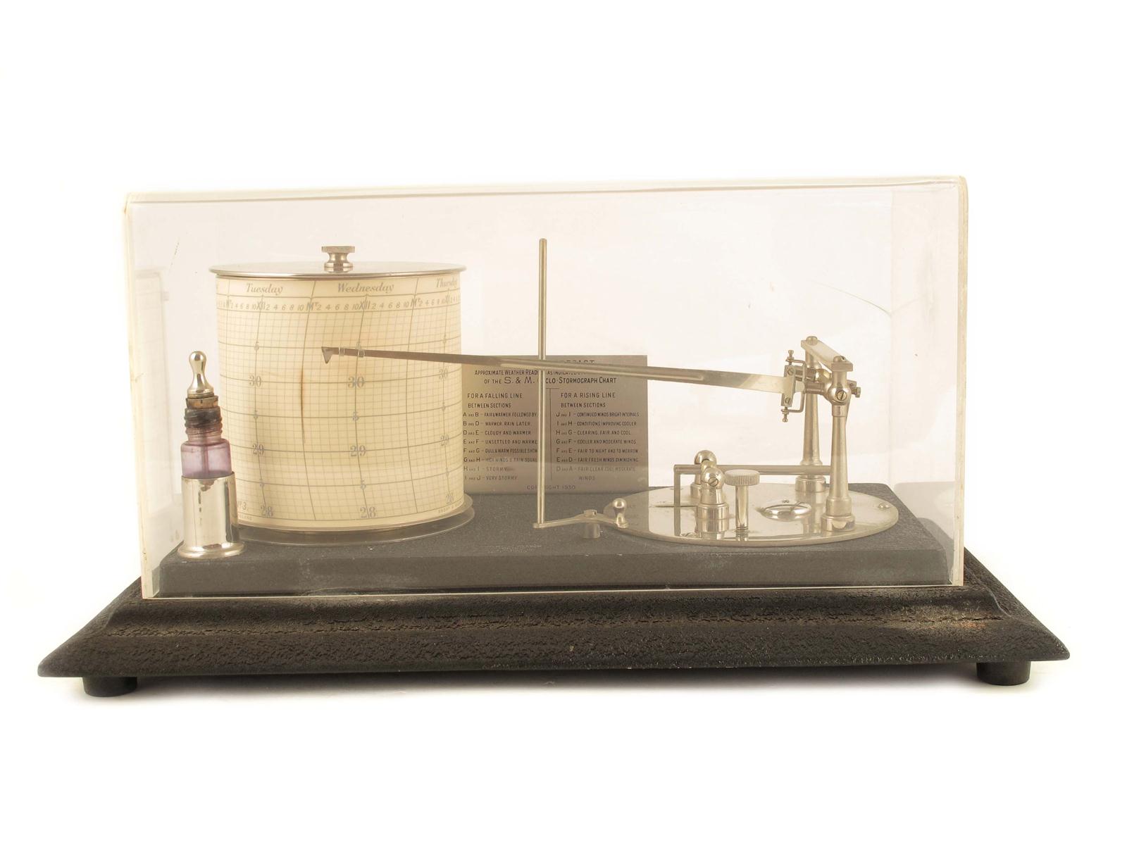 A cast iron and chrome barograph by Short & Mason, No. F 5554, with Cyclo-Stormograph and weather forecasts, with a platform lever movement, the base with ink bottle and chart, with perspex cover, 13.5in (33cm) w.
