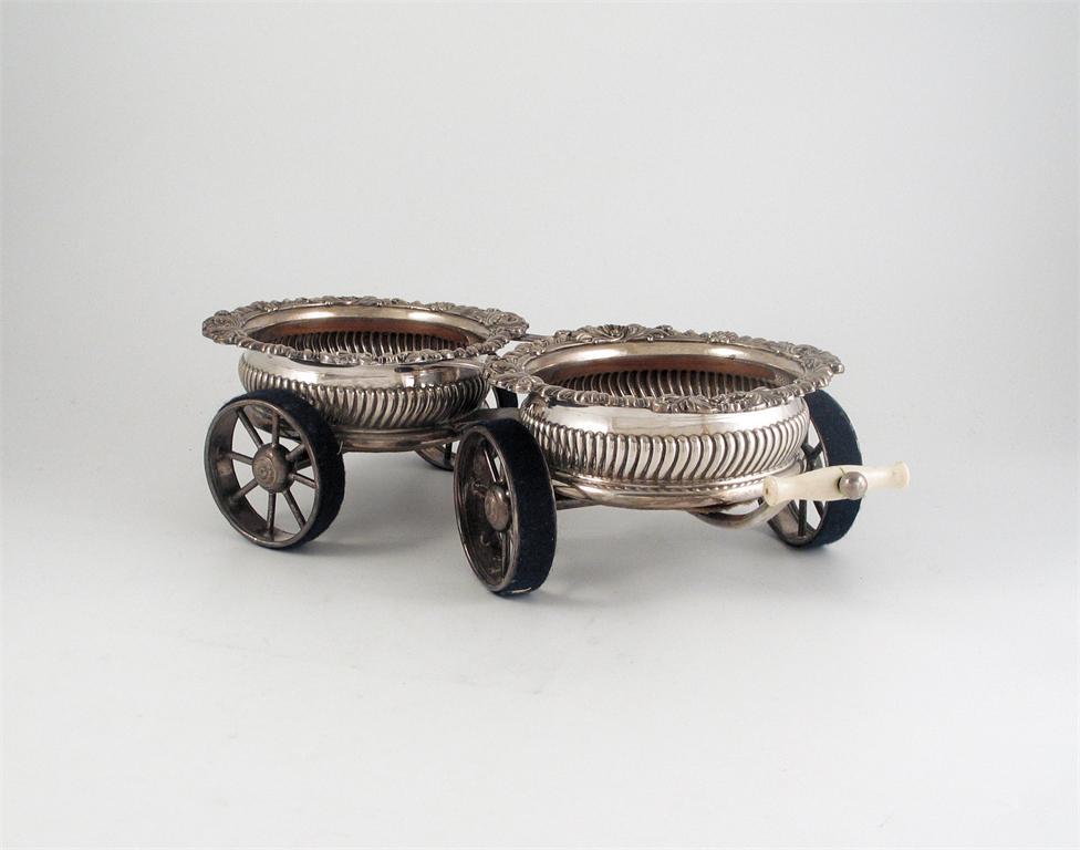 An Old Sheffield plated double coaster trolley, with four spoked wheels (the front two articulated), turned wooden bases with inset bosses, borders of foliage and gadrooning and an ivory handle, c.1840, 16.4in (41.7cm) long.