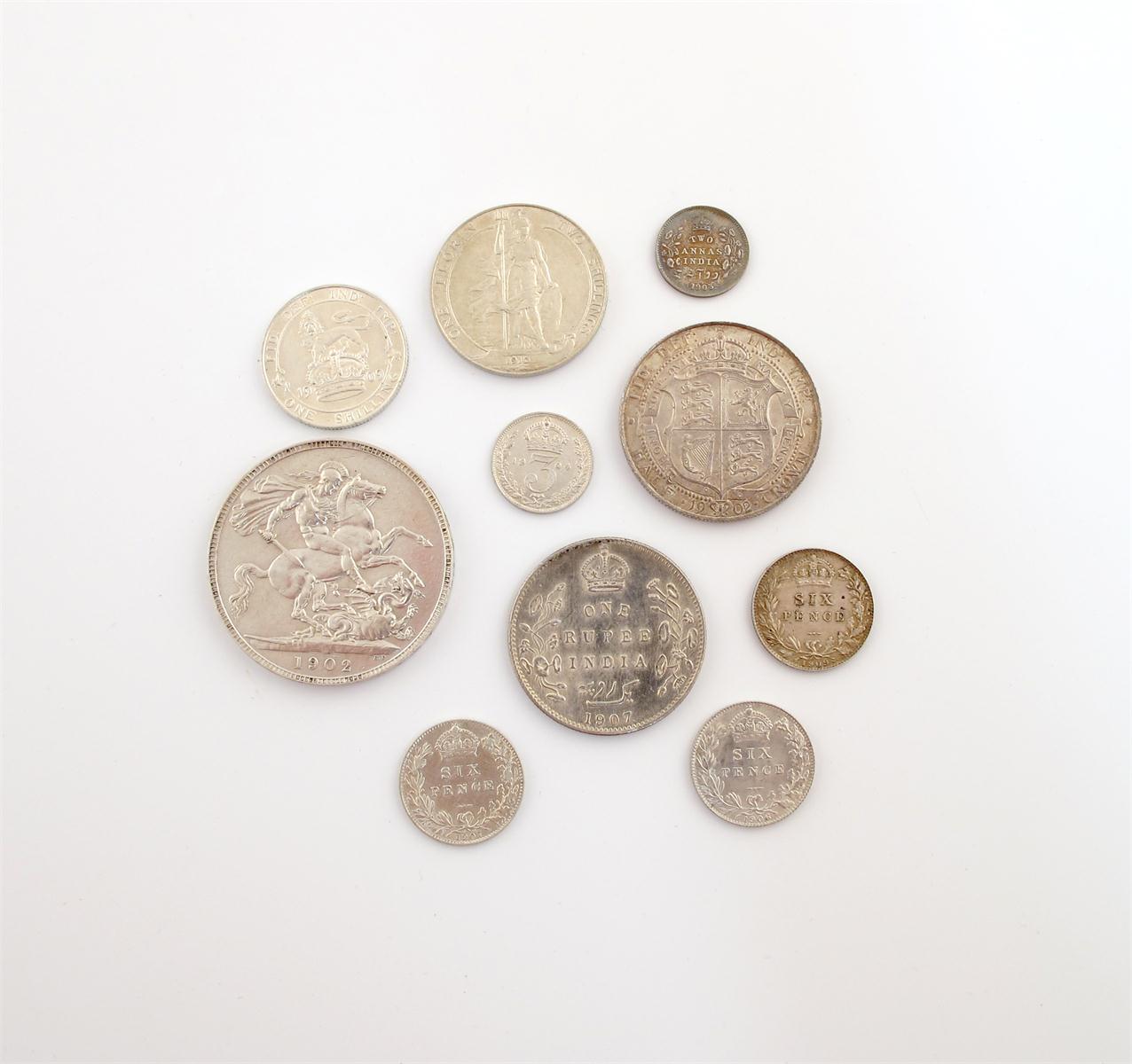 Edward VII, Crown, 1902, Halfcrown, 1902, Florin, 1910, Shilling, 1909, Sixpences (3), 1906, 1907, 1909, Threepence, 1904; (S 3978, 3980-84); India, Rupee1907 (Pr 193), 2-Annas, 1905. Very fine to extremely fine. (10)