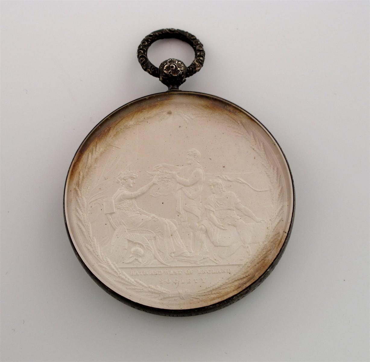 Bath and West of England Agricultural Society, a frosted and glazed silver medal, by J. Milton, "Awarded to Mr George Guard at Yeovil Meeting, 1856, for a Grey Hack Gelding "Saddler", bust of Francis Russell, Duke of Bedford right, rev Britannioa awards wreath to two farm workers, 60mm (BHM 547; Eimer 938), the glass lunettes within (named) silver edge, with ornate suspension loop and ring. Virtually mint state, but peripheral toning to medal.