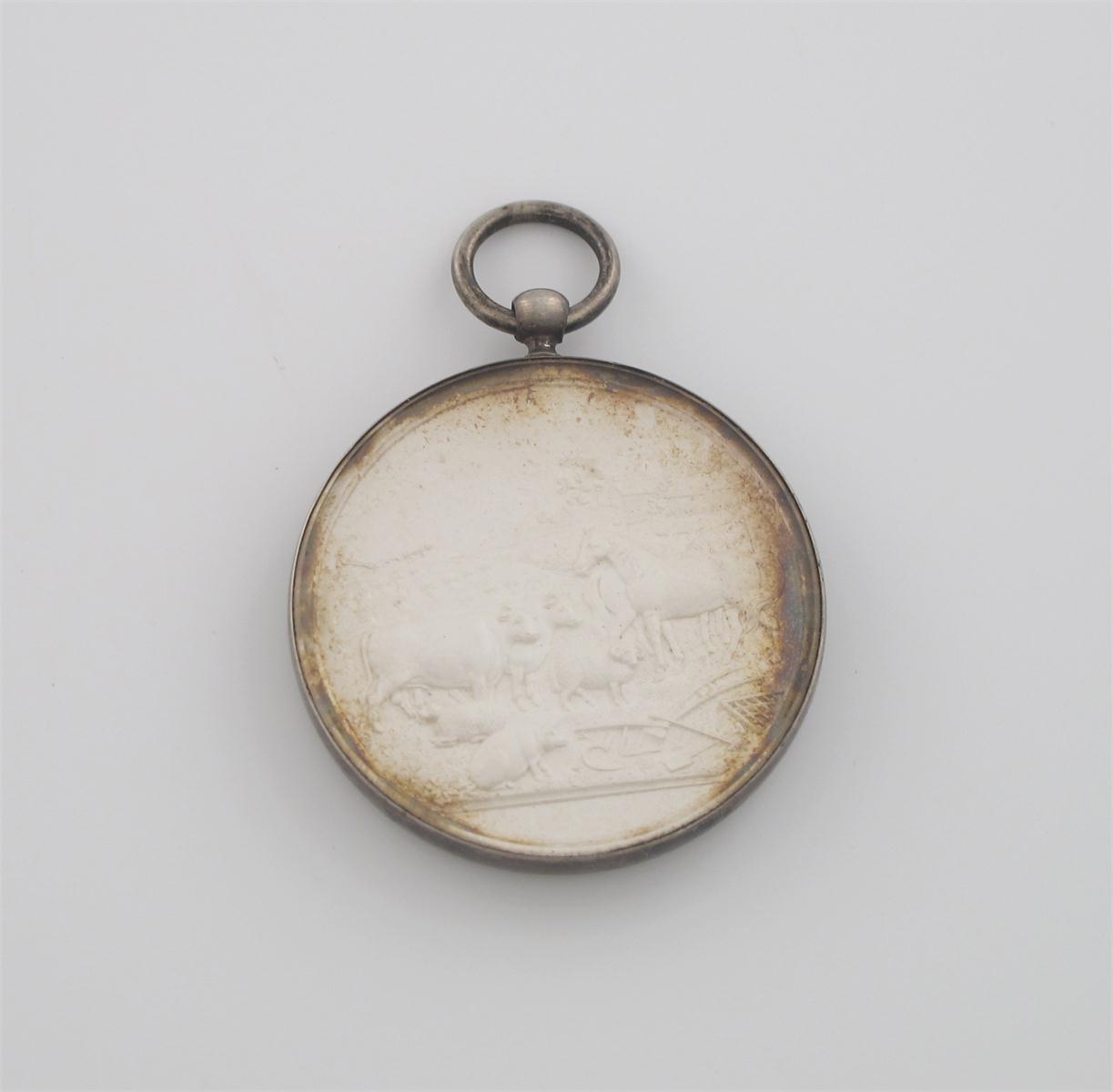 Ormskirk and Southport Agricultural Society, a frosted and glazed silver medal, "Presented to Mr Saml Clough for the 2nd Best Bull of the short-haired breed - Aug 25th 1857", a farmyard scene, rev legend and, within wreath, engraved inscription, 49mm, the glass lunettes within silver edge, with suspension loop and ring. Virtually mint state, but peripheral toning to meal.