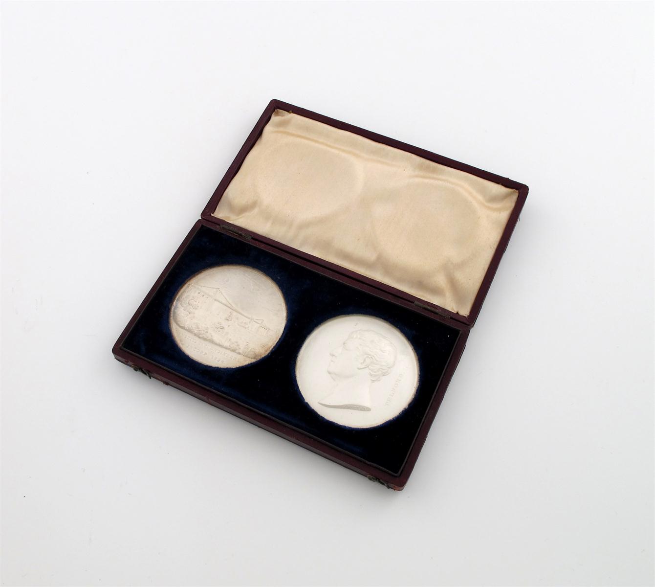 The "Telford Medal" of the Institute of Civil Engineers, frosted and glazed silver clichés of the obverse and reverse, 1828, by William Wyon, head of Telford to left, rev the Menai suspension bridge each 56mm (BHM 1328), contained in a presentation maroon leather fitted case. Obverse cliché mint state, the reverse with some marks under the glass, very rare.