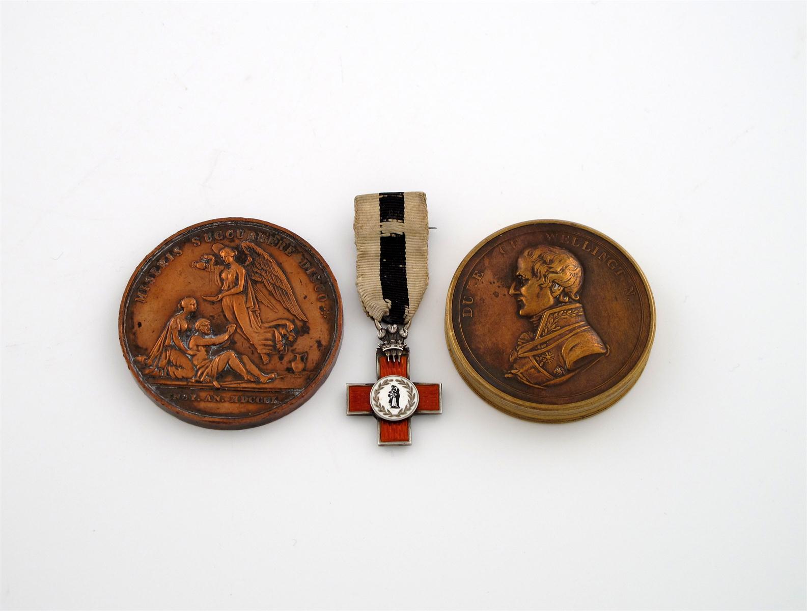 The Duke of Wellington's Continental Victories, a bronze box medal, containing a set of paper roundels printed with the names of the battles, uniformed bust of Wellington left, base, inscription in wreath, BY HIS CONSUMATE SKILL …, 47mm (BHM 885; Eimer Wellington 82; Eimer 1075a), very fine; Manchester School of Medicine, un-named copper prize medal, 1850, 50mm; League of Mercy enamelled cross, 22mm, these varied state. (3)