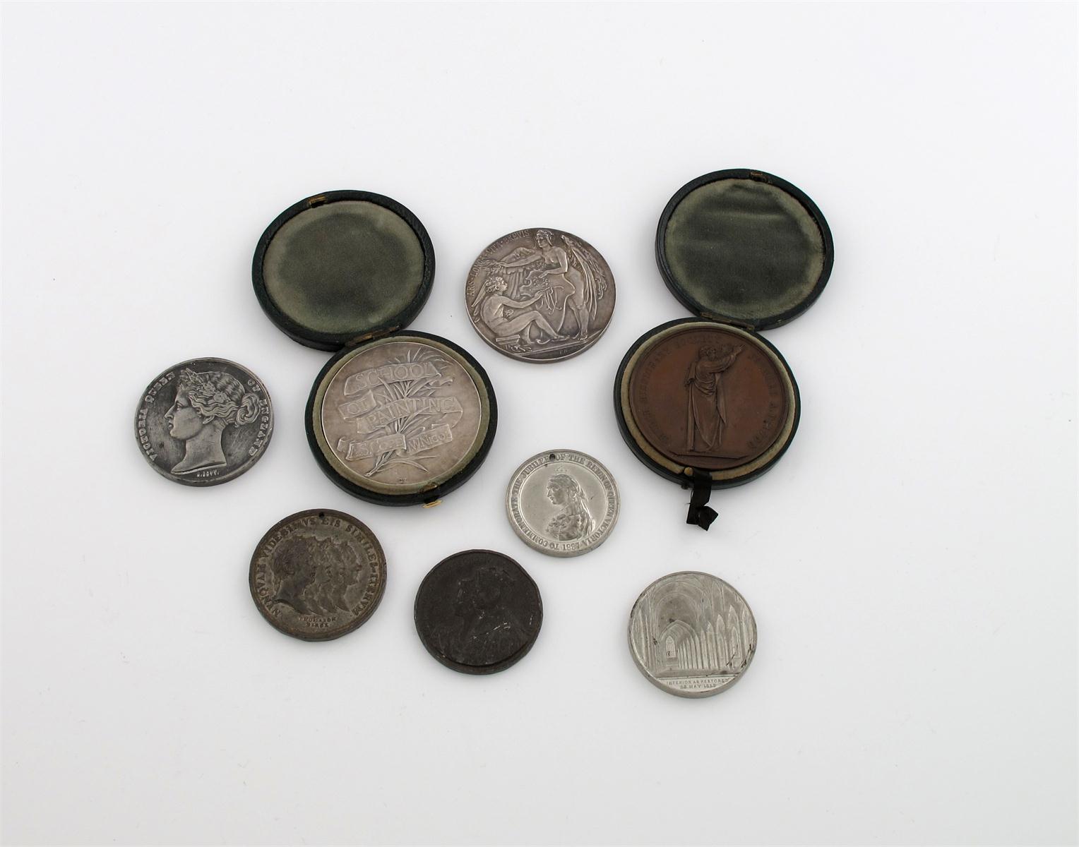 The Cope and Nicol School of Painting, South Kensington, a pair of silver prize medals, awarded 1891-92 and 1892 to Annie Thring, "Painting Head from Life" and "Painting Nude from Life"; by Frank Bowcher, a naked winged Victory awards a wreath to a naked student who inscribes a shield "ART", 57mm, struck in France and edge stamped ARGENT, in cases of issue, extremely fine; sundry medallions, copper (1), white metal (5), these varied state. (8)