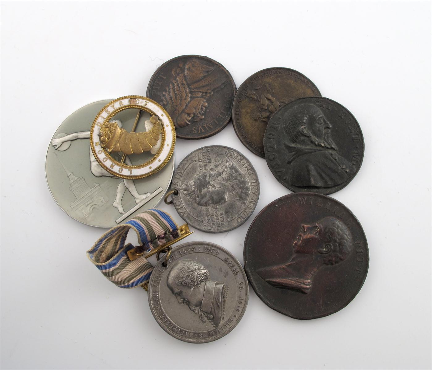 Historical and commemorative medals; mostly British, including Royalty, William Pitt, Stamp Duty (Eim 713); Shakespeare, Handel, etc. Mostly fair to fine. (qty)