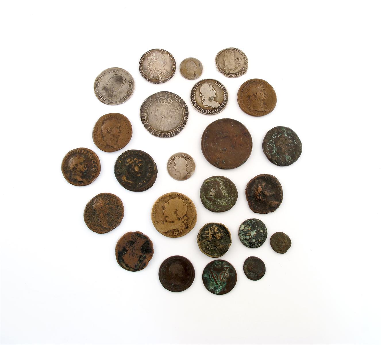 Charles I, Shilling, Tower mint, Group D, mm portcullis, 1633-34 (S 2789), fine; and Sixpence, cut and worn; George III, Shilling 1787, very fine; Spain, Ferdinand VII, 2-Reales, 1811, 1820; other coins, silver, copper and bronze, Ancient world, others, varied state, except as stated. (qty)