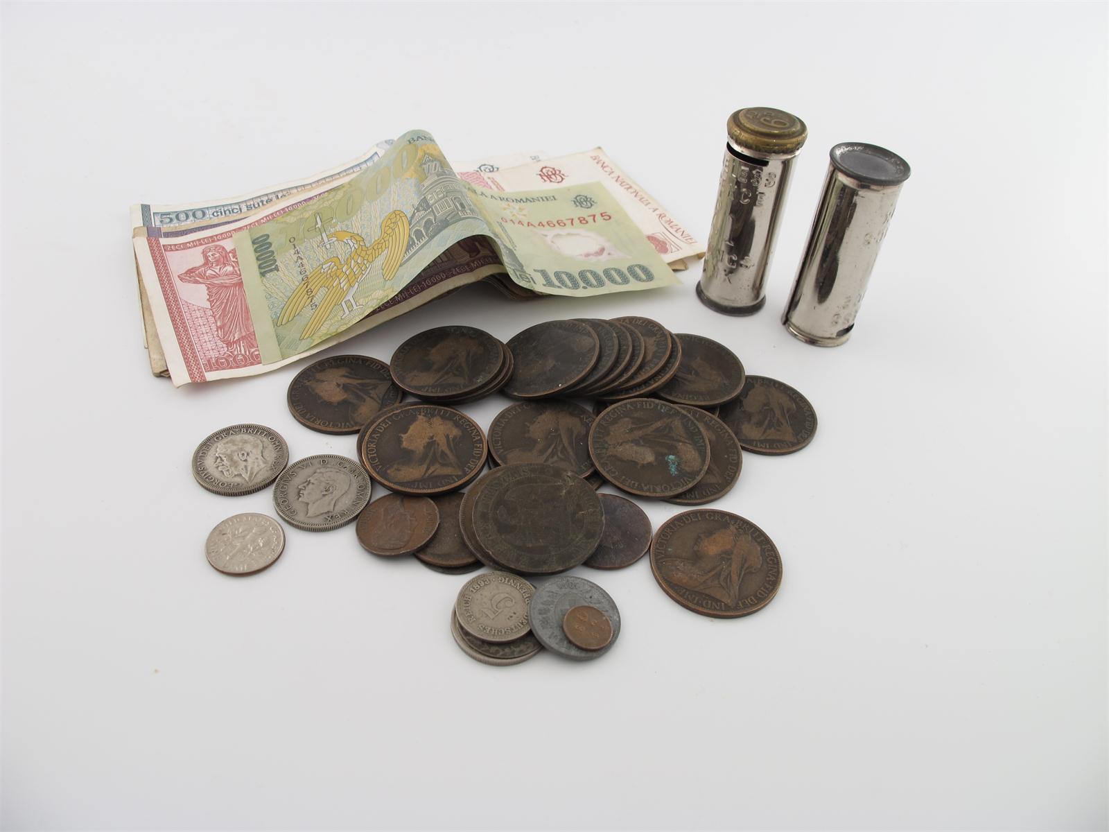 Miscellaneous British and Foreign coins and banknotes, including Victorian and more recent copper coins including pennies; Romanian banknotes and American coins, etc. (qty)
