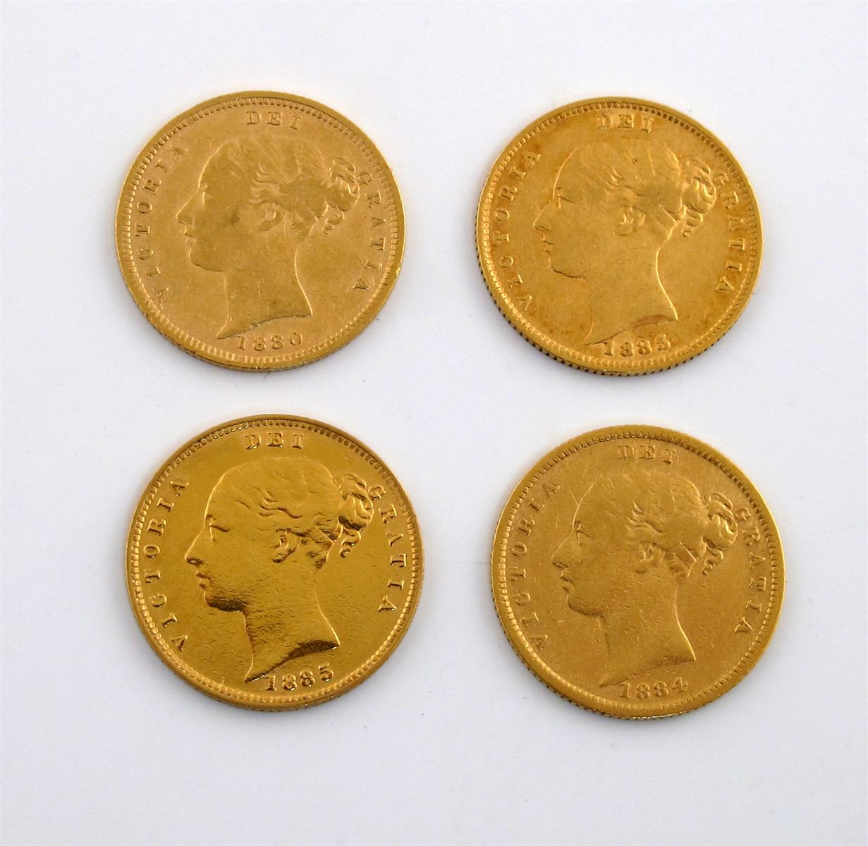 Victoria (1837-1901), gold Half-Sovereigns (4), young head, 1880, die no 115, 1884, 1885 (2) (S. 3860F, 3861). Fine, one 1885 buffed. (4)