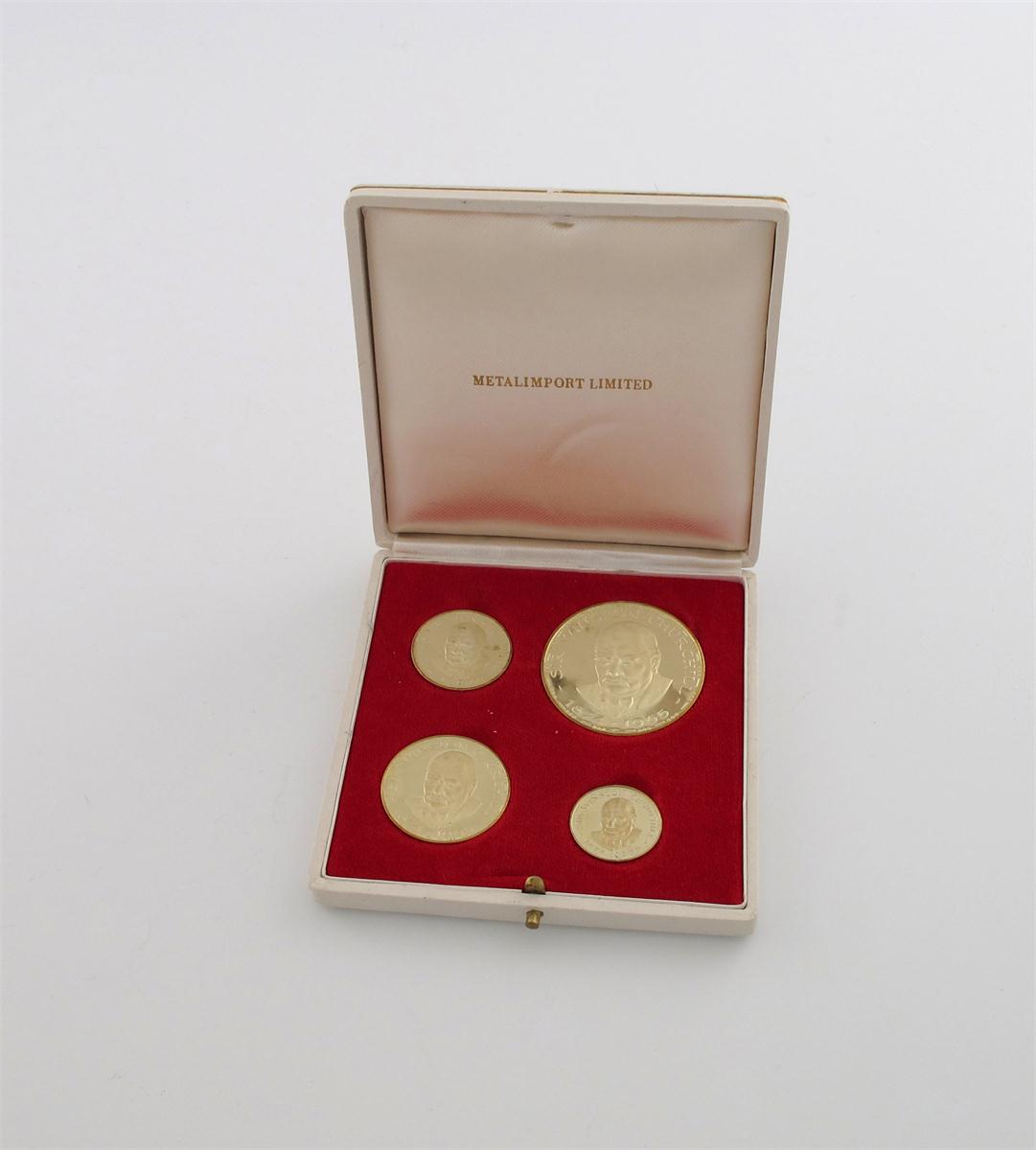 Sir Winston Churchill, Death 1965, a set of four gold medals, by Costantino Affer for Metalimport, bust threequarters-left, rev "V" sign and flags, 40, 30 25 and 21mm, .750 fine, total wt. 56.5gms (Engstrom 33), believed 2500 sets issued, in case of issue. Virtually mint state. (4)