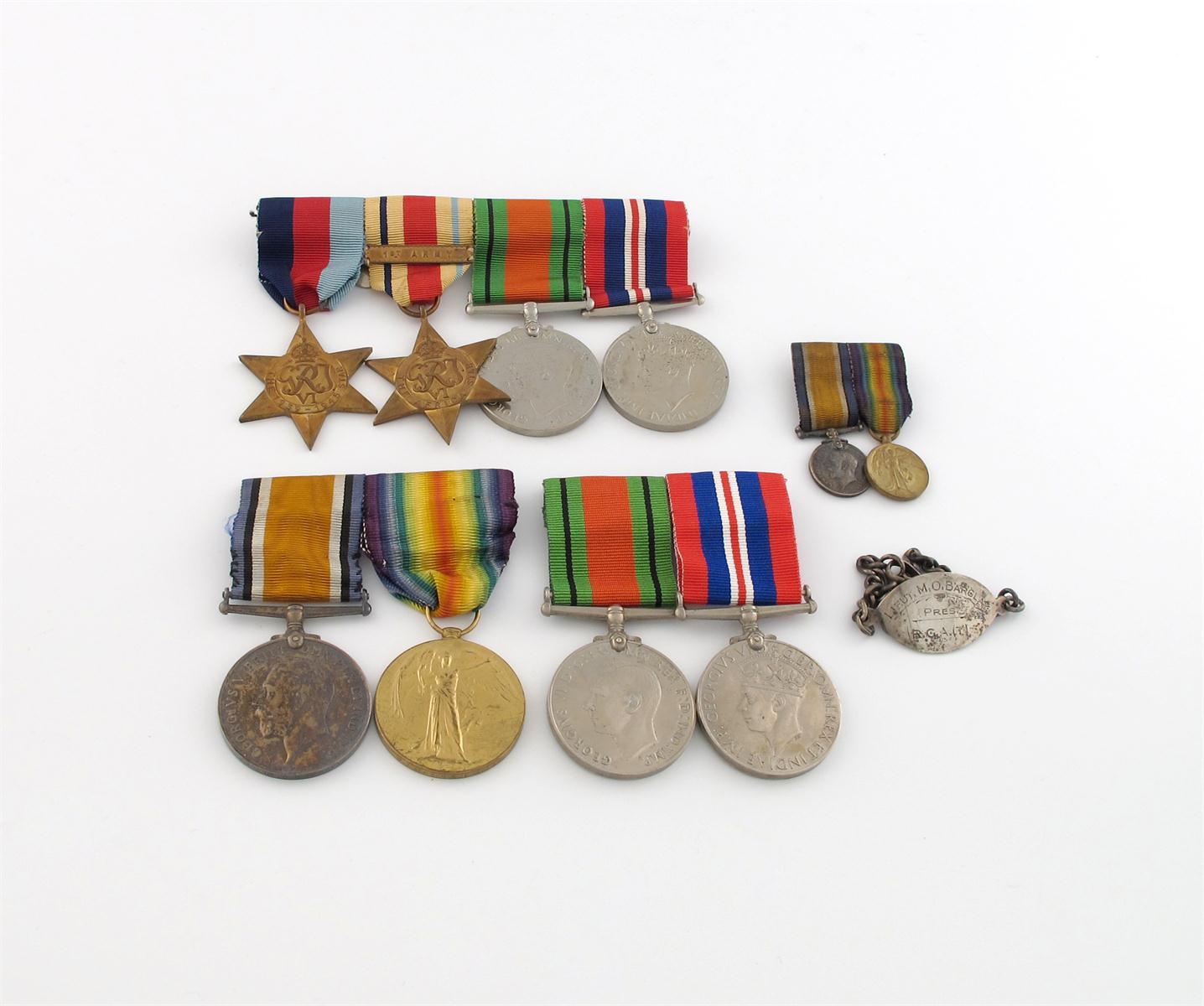Word War I pair, War and Victory medals (2. Lieut M. O. Barclay), with miniatures and identity tag, "Lt. M. O. Barclay"; WW II, group of four medals, 1939-45 and Africa stars, later with clasp 1st Army; Defence and War medals. Very fine. (7)