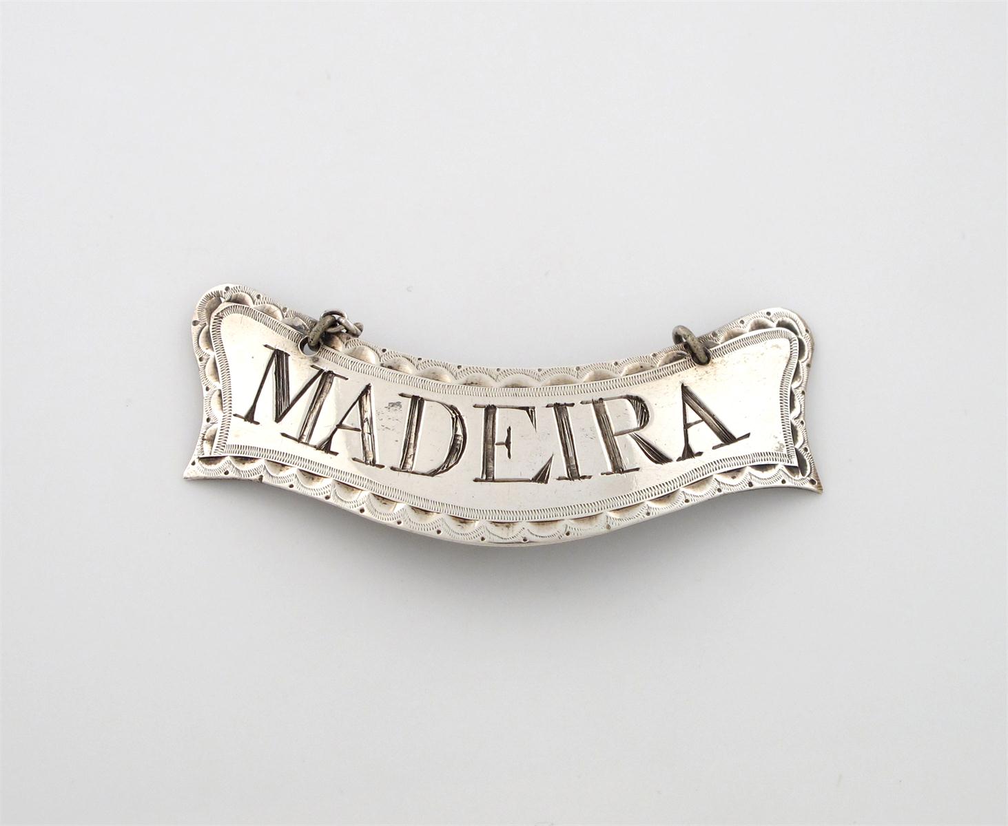 A George III Irish silver wine label, by Benjamin Tait, Dublin circa 1790, banner form, bright-cut border, incised 'MADEIRA', length 5.5cm.