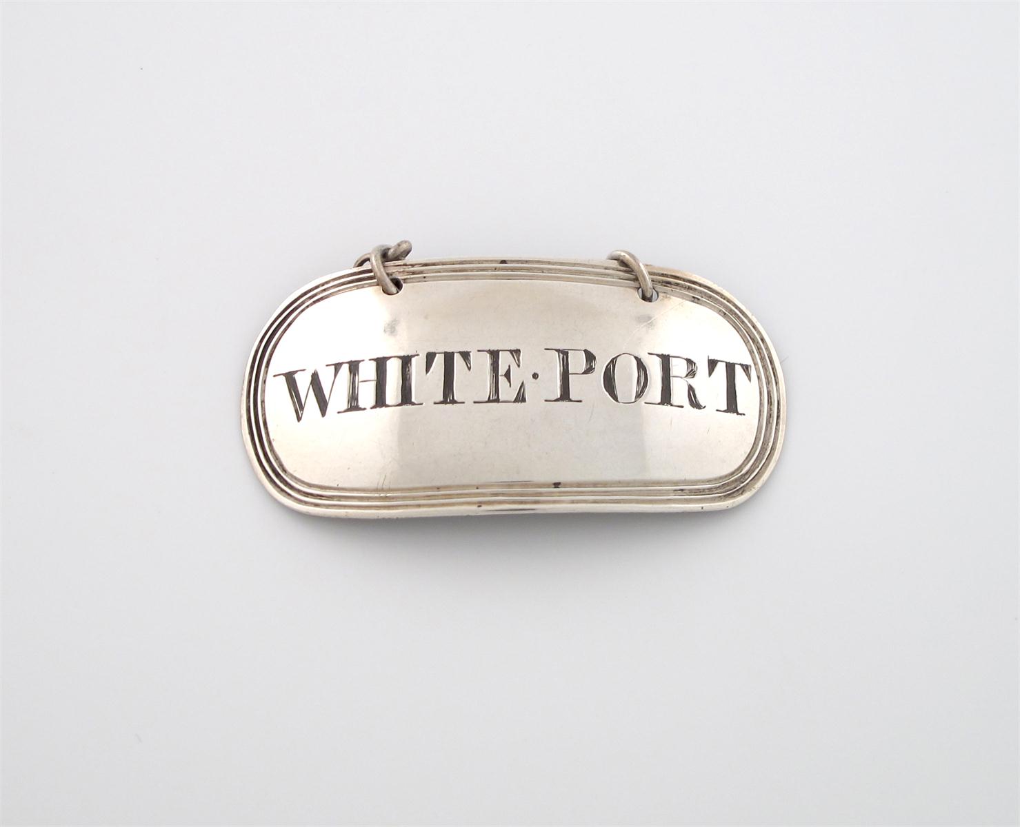 A William IV silver wine label, possibly by William King, London 1836, oblong form, reeded border, incised 'WHITE . PORT', length 5cm.