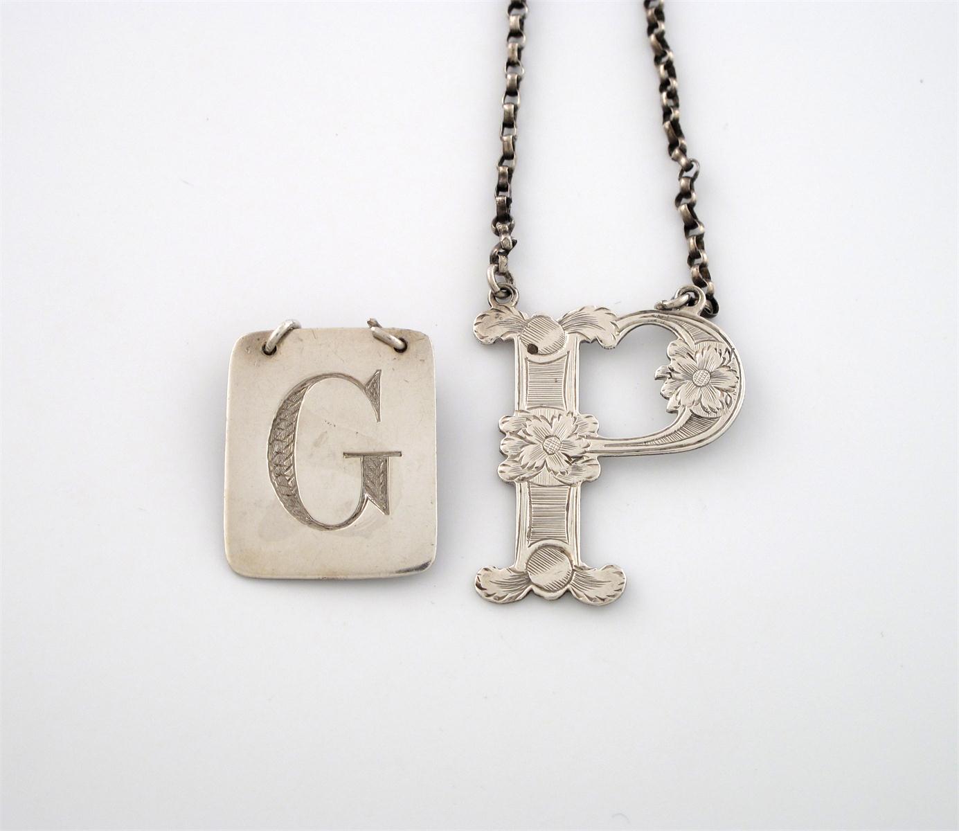 rectangular form, incised 'G', plus a Scottish silver cut-out letter 'P' wine label, by William Cunningham, engraved decoration. (2)