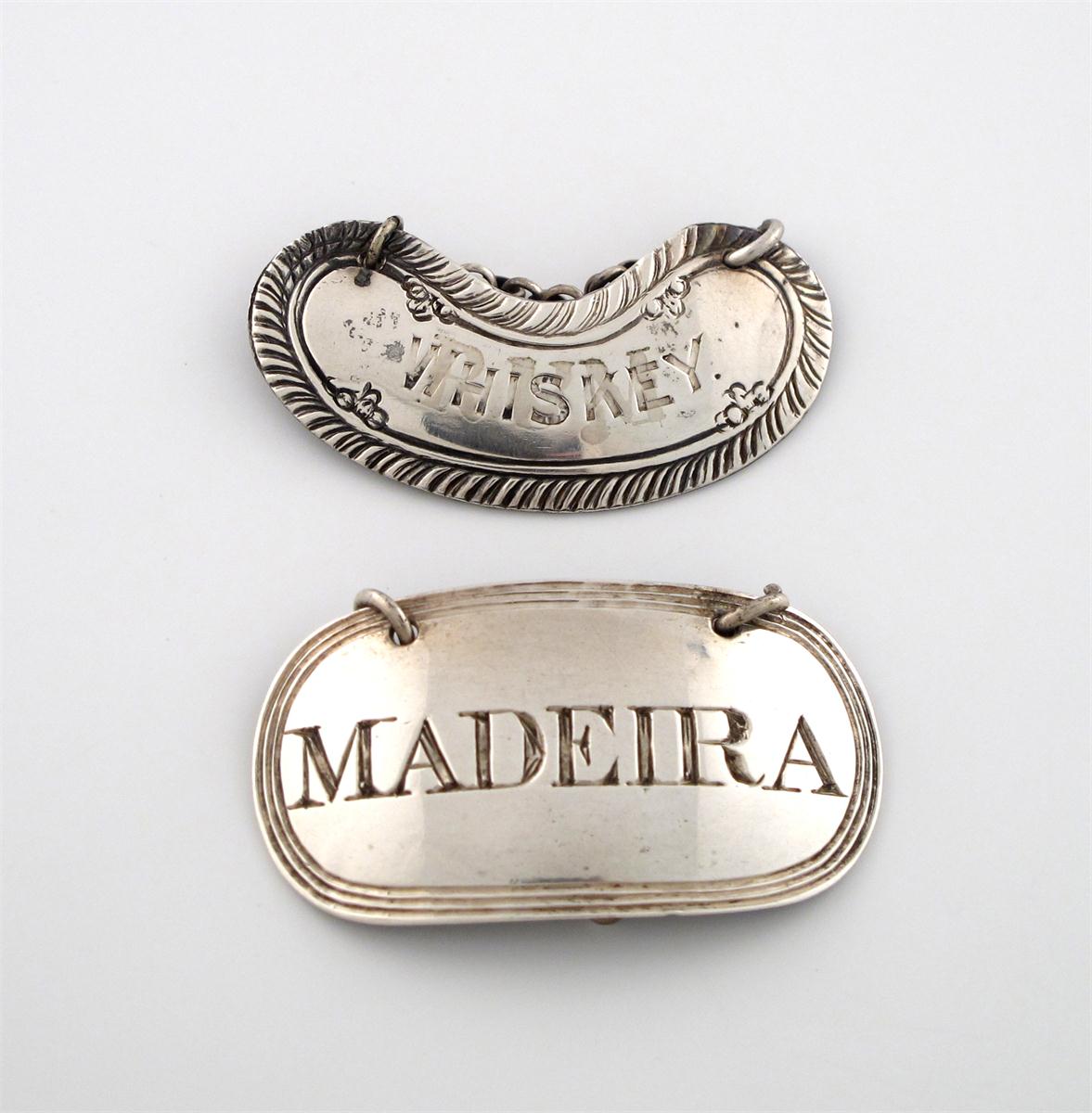 kidney form, feather- edge border, incised 'WHISKEY', plus a Victorian silver wine label, by Rawlings and Summers, London 1859, oblong form, reeded border, incised 'MADEIRA'. (2)