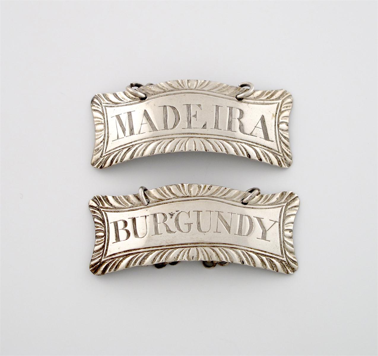 shaped rectangular form, feather-edge border, incised 'MADEIRA' and 'BURGUNDY', length 5cm. (2)