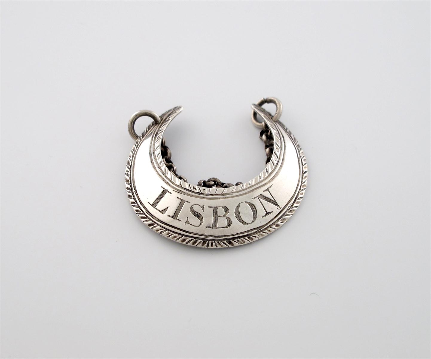 A George III silver wine label, possibly by John Harvey, London circa 1780, crescent form, feather-edge border, incised 'LISBON', length 3.4cm.