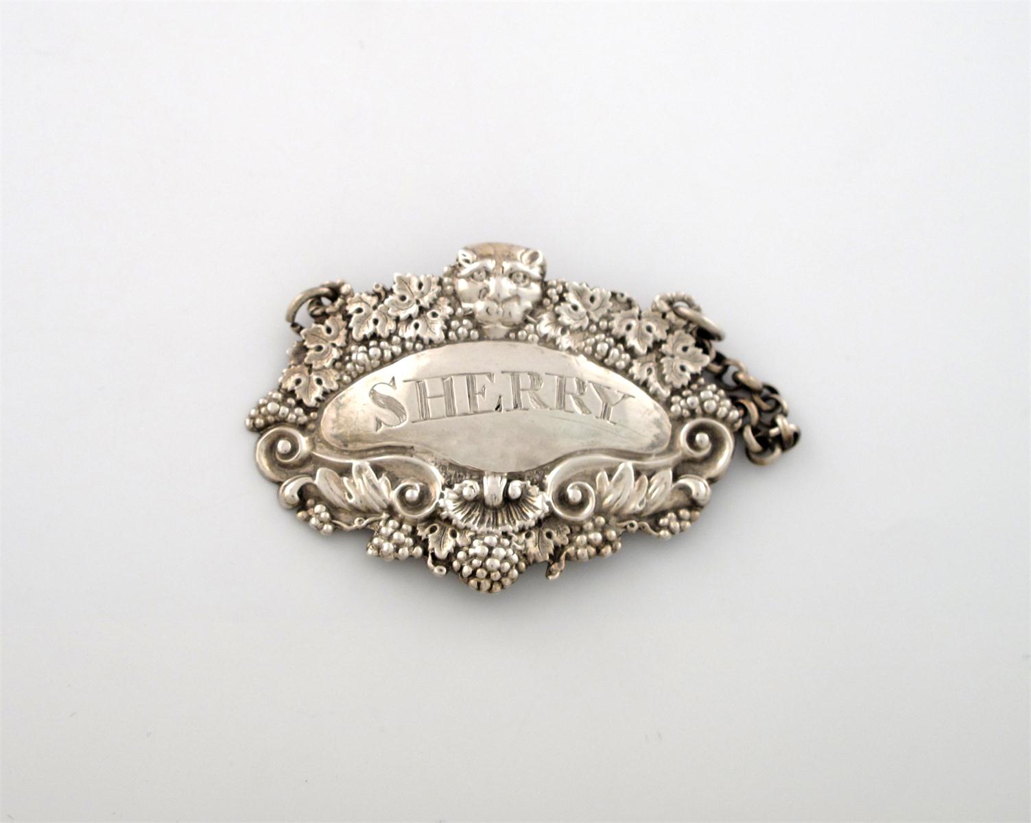 shaped oval form, with a leopard's head mask and vine leaf decoration, incised 'SHERRY', length 5.2cm.
