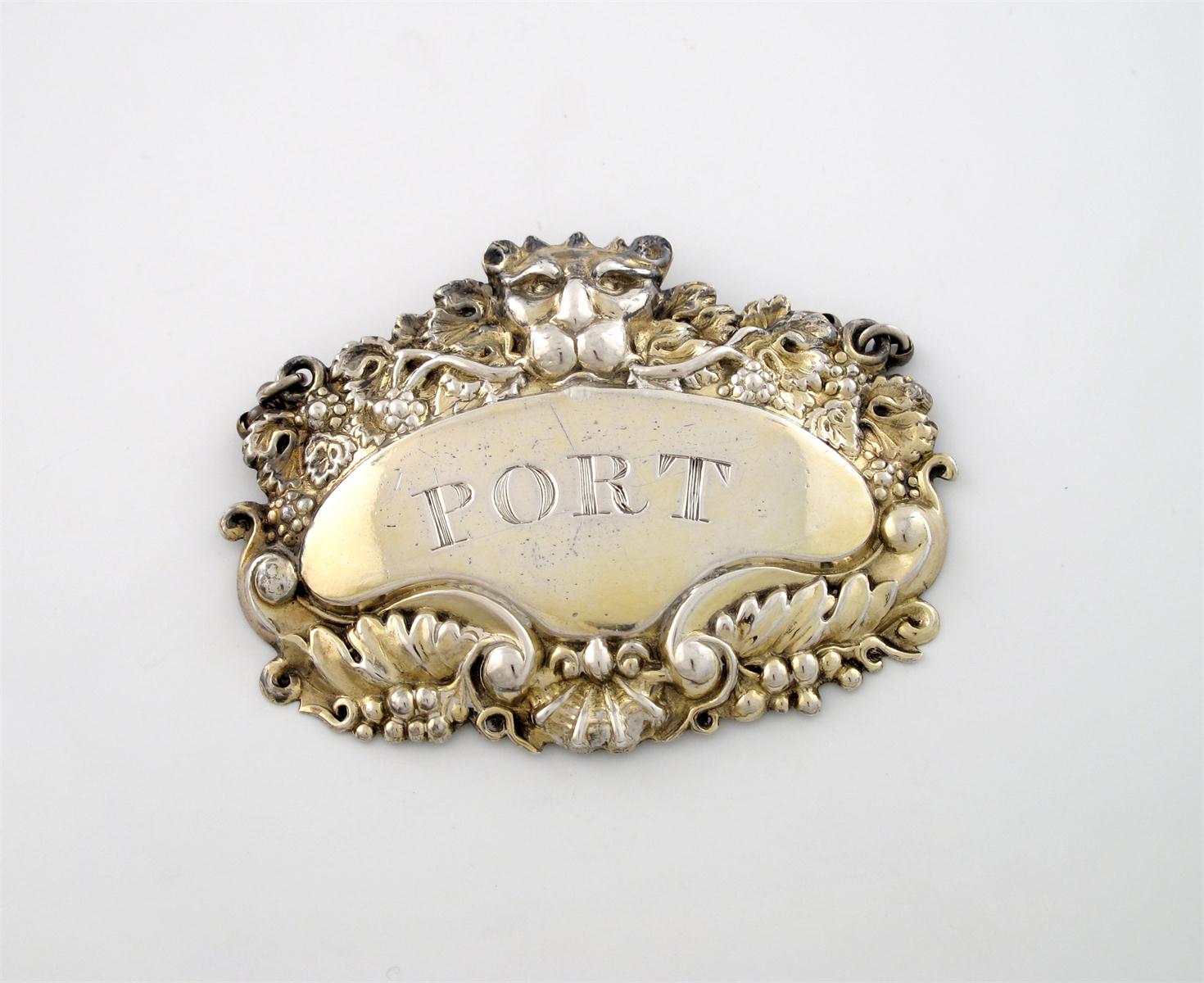 shaped oval form, with a leopard's head mask and trailing grapevines, incised 'PORT', length 6.8cm.