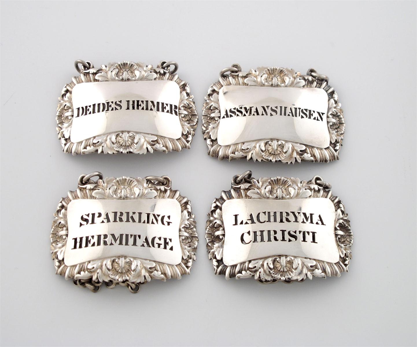 A rare set of four Victorian silver wine labels