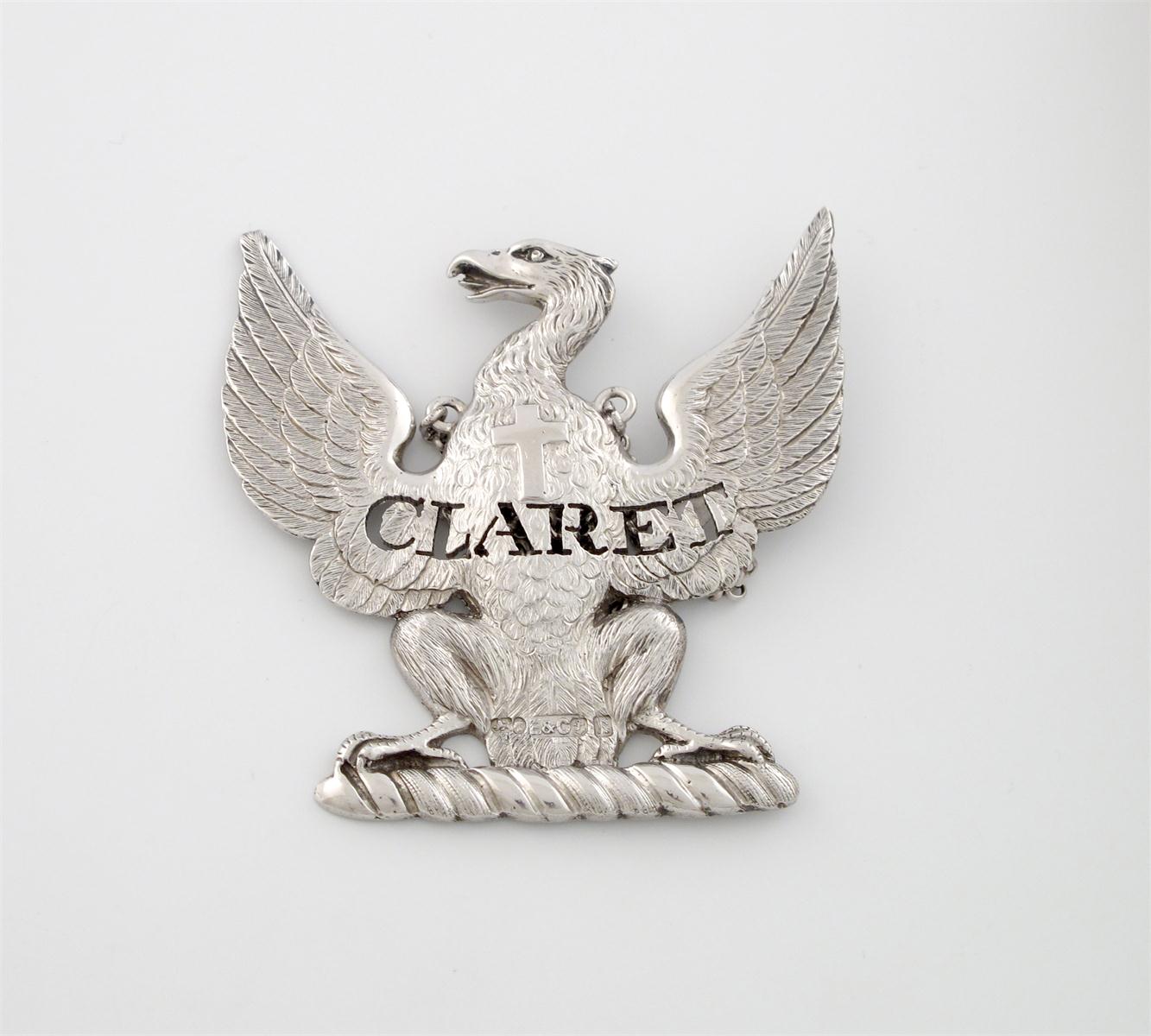 A Victorian silver armorial wine label, by Elkington and Co, Birmingham 1853, modelled as an eagle with spread wings, the breast with a cross, pierced 'CLARET', height 6.5cm.