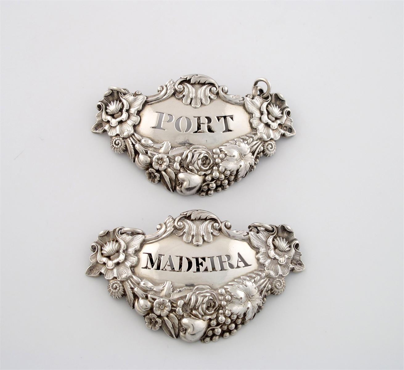 shaped form, with a heavy foliate, shell and vine leaf border, incised 'MADEIRA' and 'PORT', with heavy chains, length 8.5cm, approx. weight 3oz. (2)
