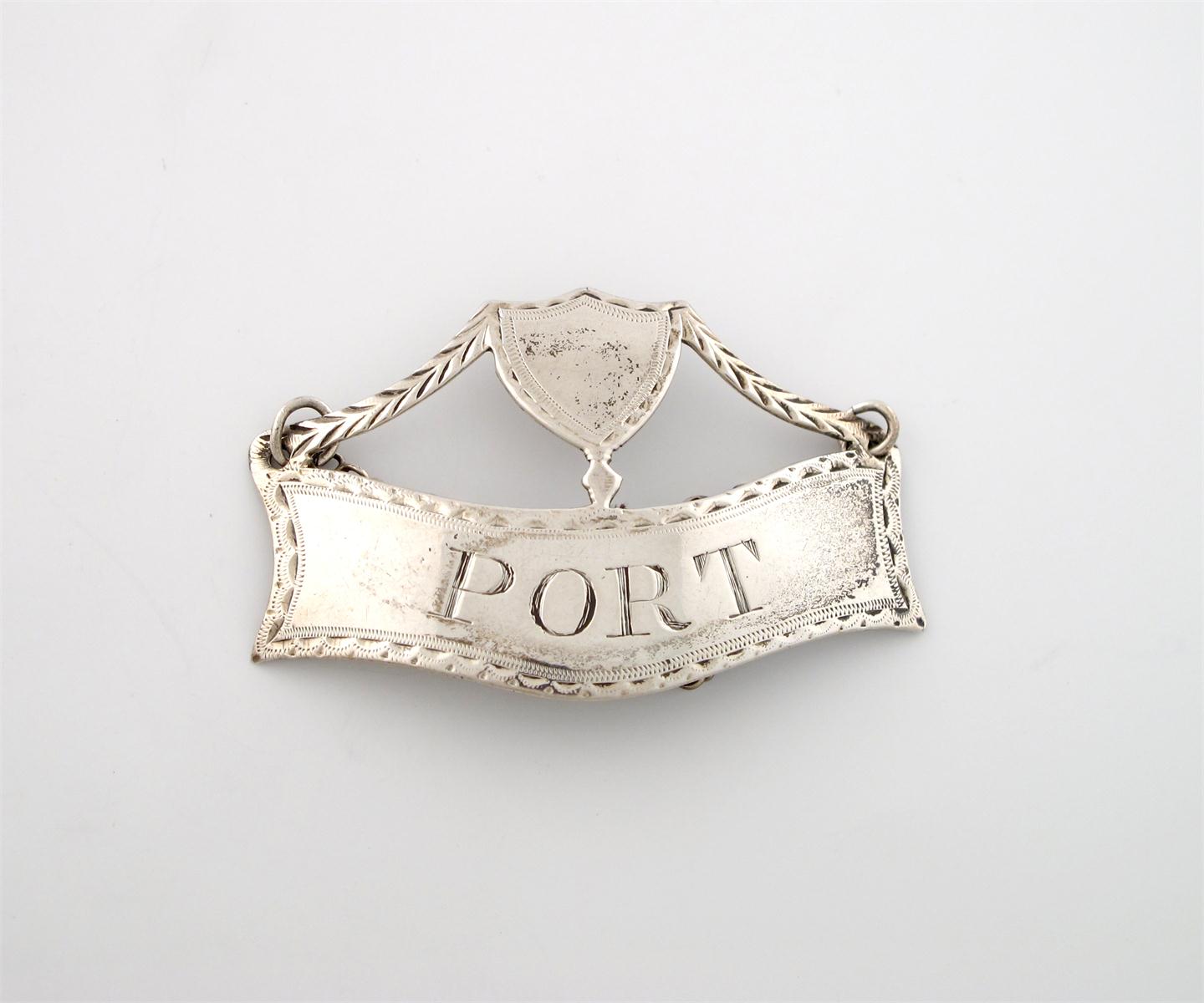 banner form, with a raised and pierced shield pediment, bright-cut borders, incised 'PORT', length 5.5cm.