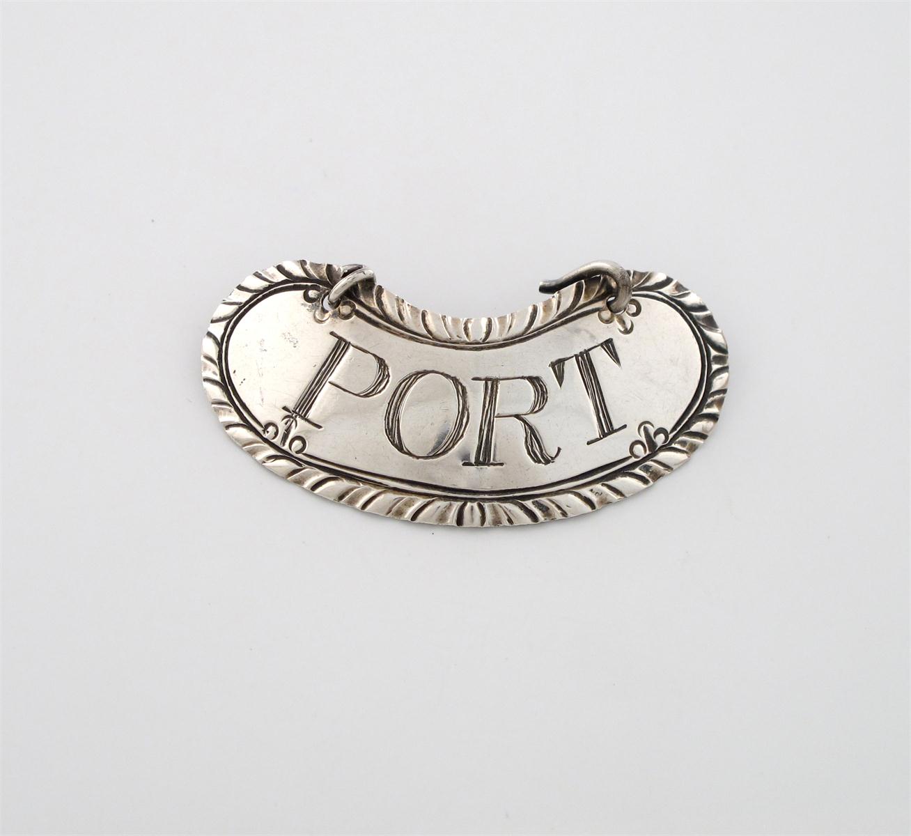 A George III silver wine label, by Mary Binley, London circa 1770, kidney form, feather edge border, incised 'PORT', length 4.8cm.
