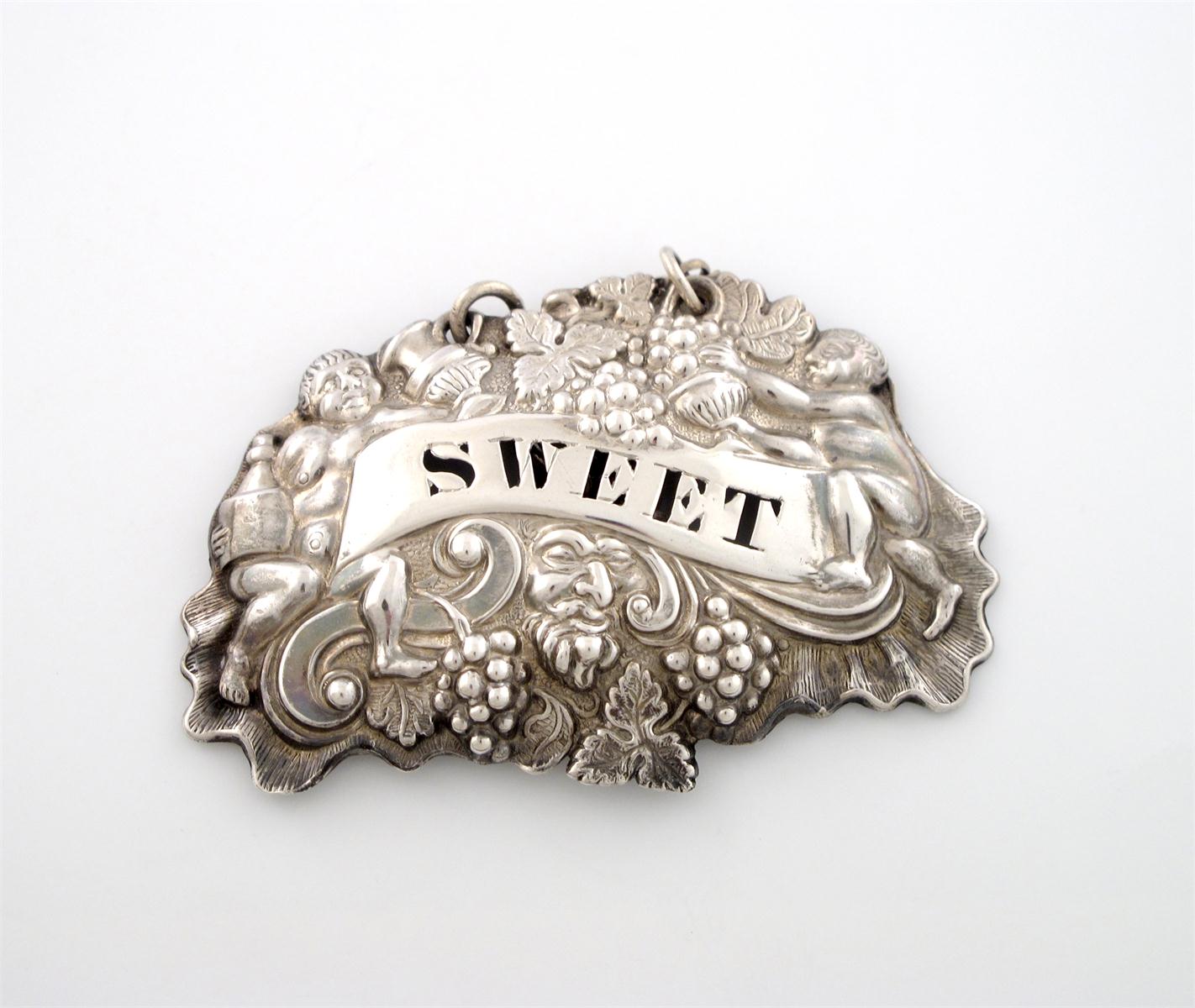 shaped form with Bacchanalian revellers and grape vines, pierced 'SWEET', length 6cm.