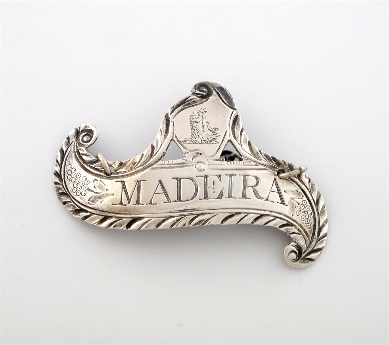 scroll form, feather-edge border, the pediment engraved with a crest, incised 'MADEIRA', length 5.4cm.