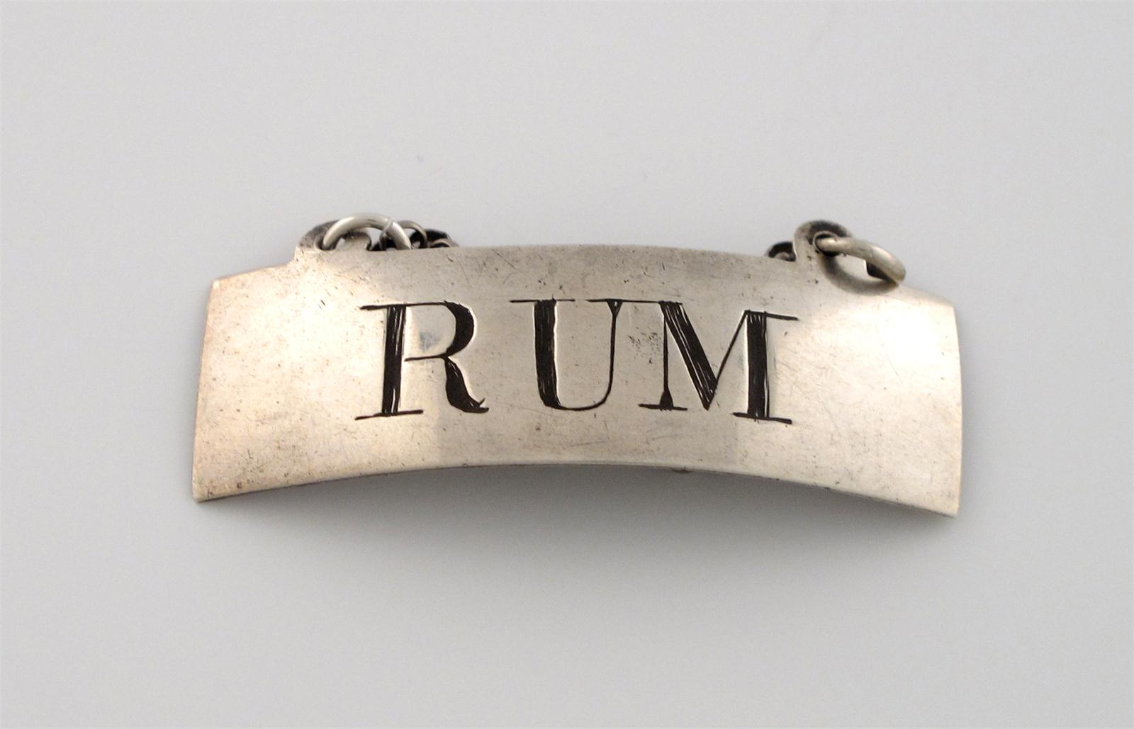 A George III Irish silver wine label, maker's mark only, for Benjamin Tait, Dublin circa 1790, rectangular form, incised 'RUM', length 4.8cm.