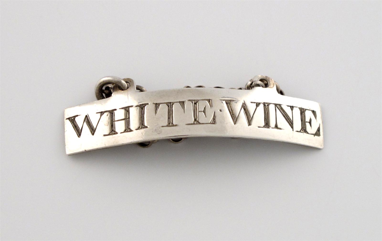 A George III silver wine label, by Mary Binley, circa 1770, slender rectangular form, incised 'WHITE WINE', length 4.4cm.
