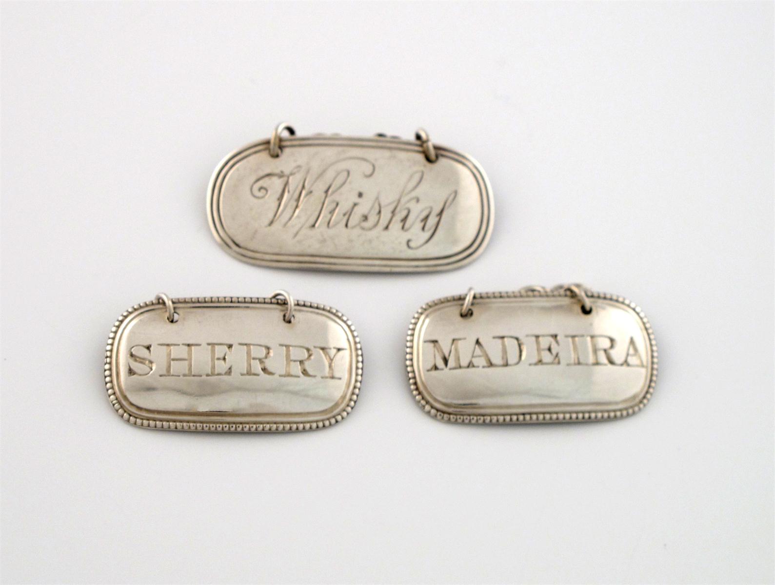 rounded rectangular form, beaded borders, incised 'SHERRY' and 'MADEIRA'. plus another silver wine label, 'WHISKY'. (3)