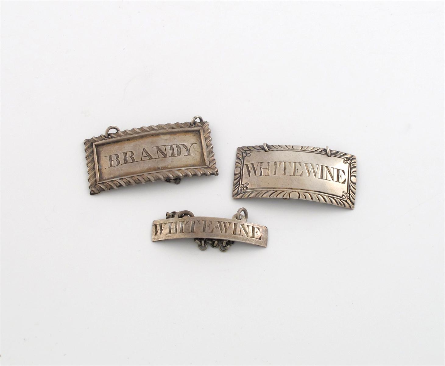 slender rectangular form, incised 'WHITE WINE', length 4.4cm, plus a George III silver wine label, by Ebenezer Coker, rectangular form, feather-edge border, incised 'WHITE WINE', plus a modern 'BRANDY' label. (3)