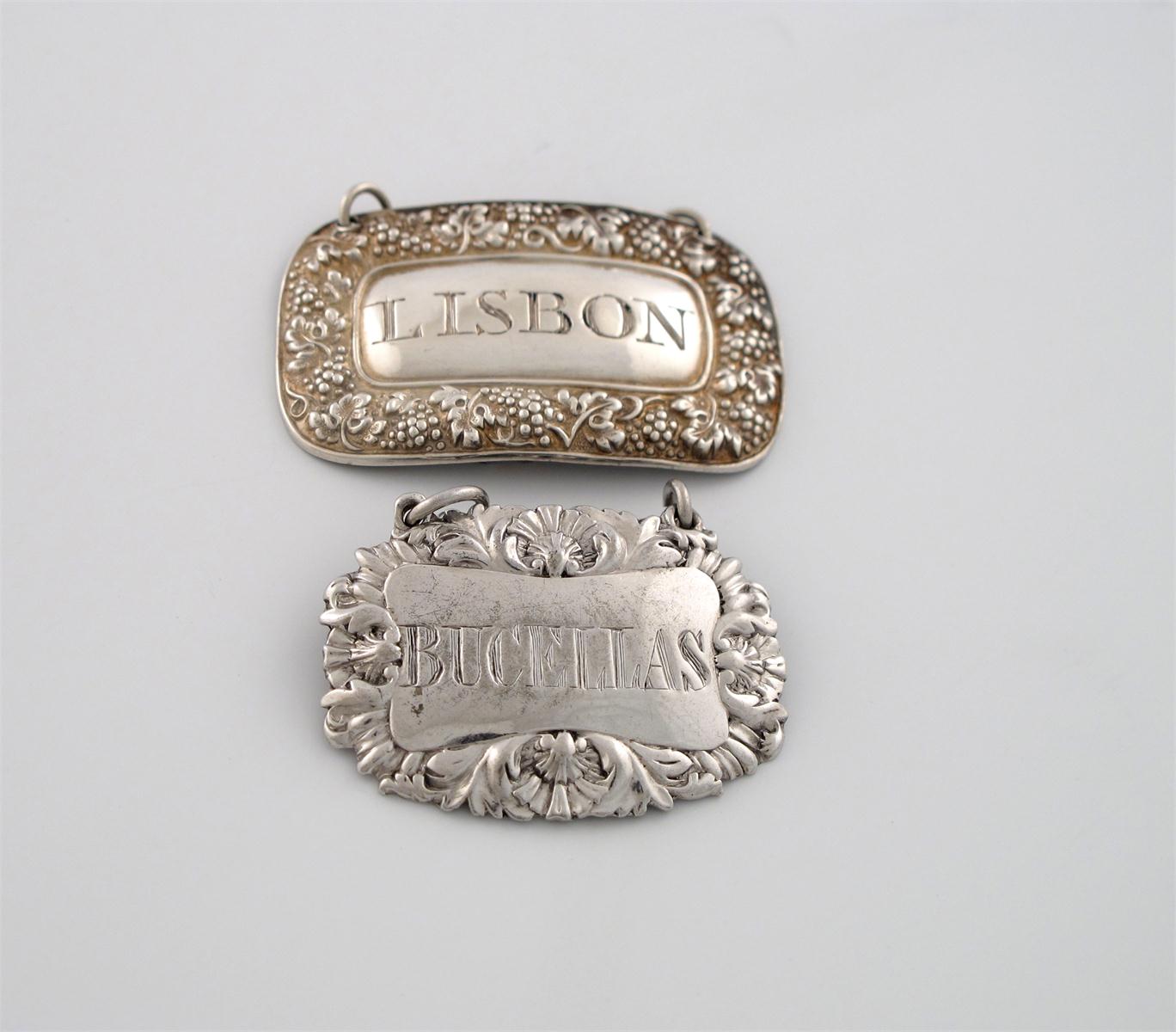 rectangular form, vine leaf border, incised 'LISBON', length 4.2cm, plus a George IV silver wine label, incised 'BUCELLAS', length 3.6cm. (2)