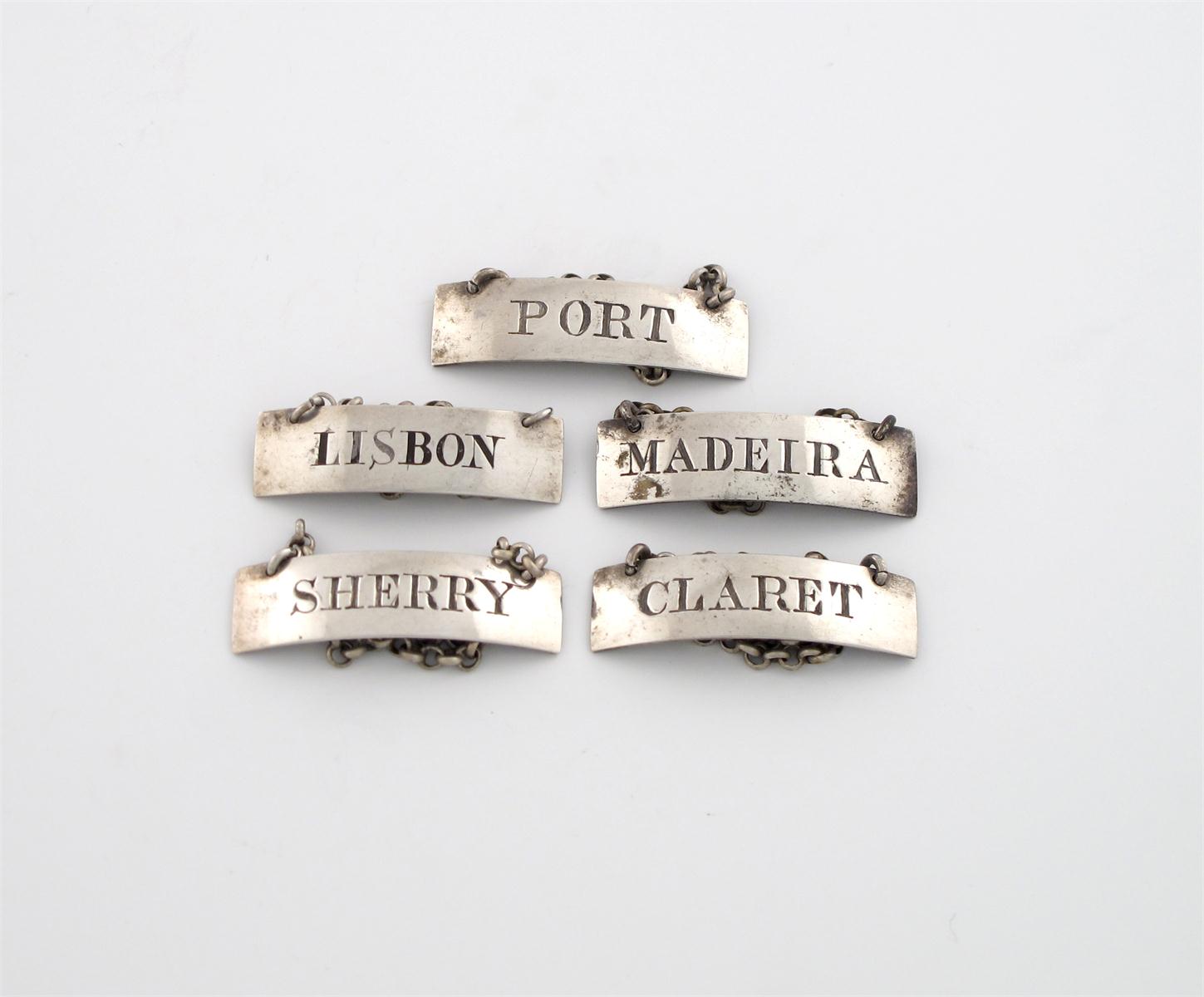 plain rectangular form, incised 'LISBON', (with traces of blackening), 'SHERRY', 'MADEIRA', 'CLARET', and 'PORT', length 4cm. (5)