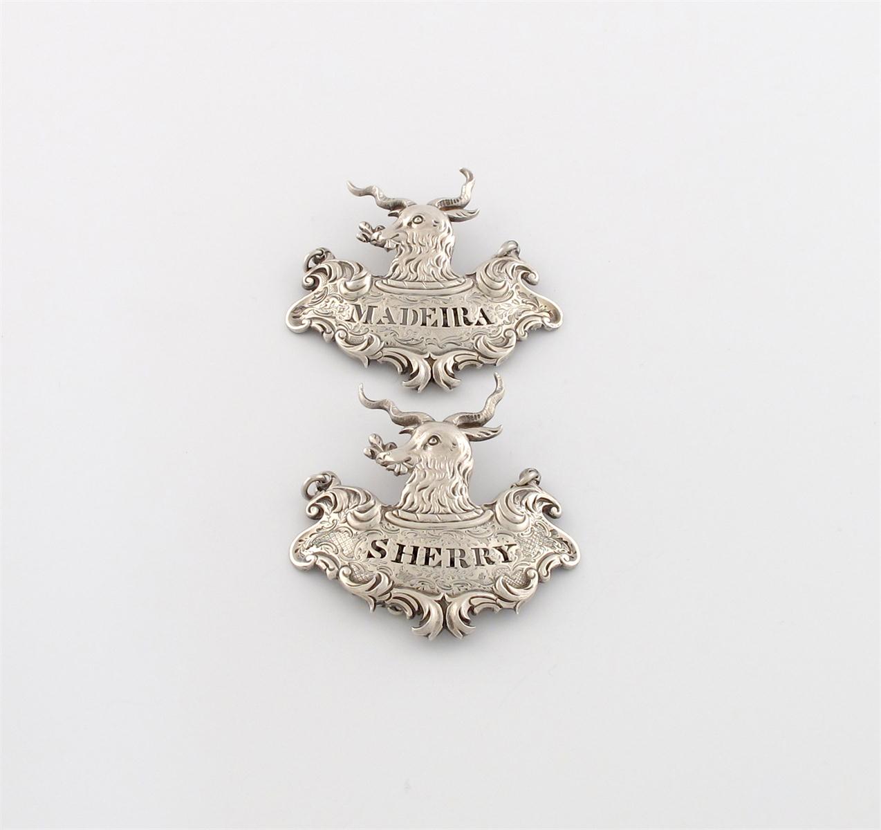 shaped form, foliate scroll borders, with a billy goat pediment, pierced 'SHERRY' and 'MADEIRA', length 6.8cm, approx. weight 1.7oz. (2)
