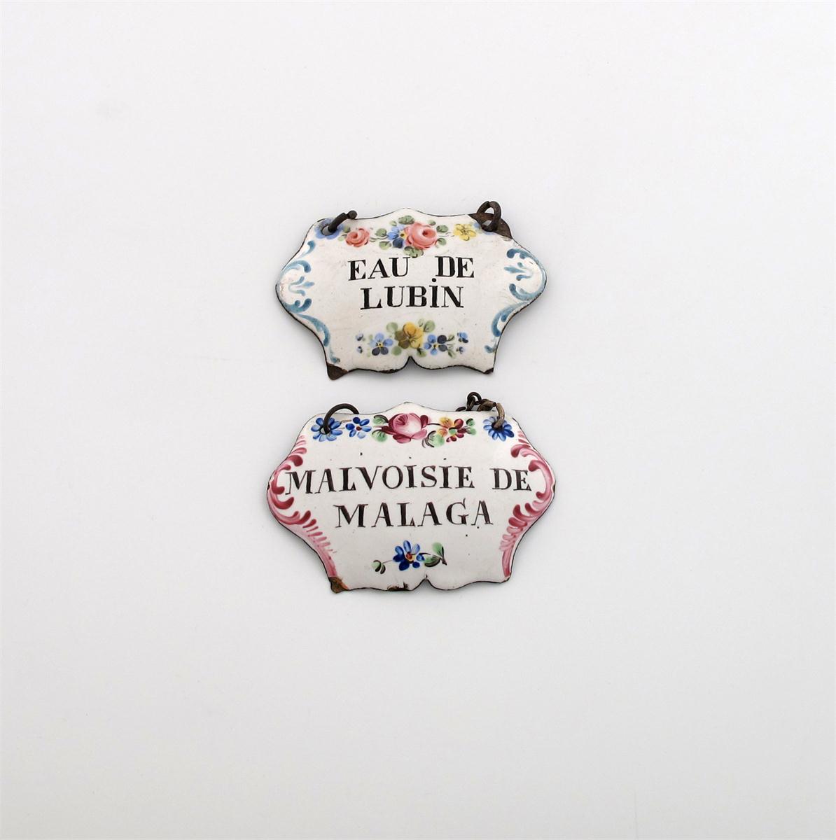 cartouche form, decorated with flowers and with green and pink foliate scroll borders, titled 'EAU DE LUBIN' and 'MALVOISIE DE MALAGA', length 5.4cm. (2)