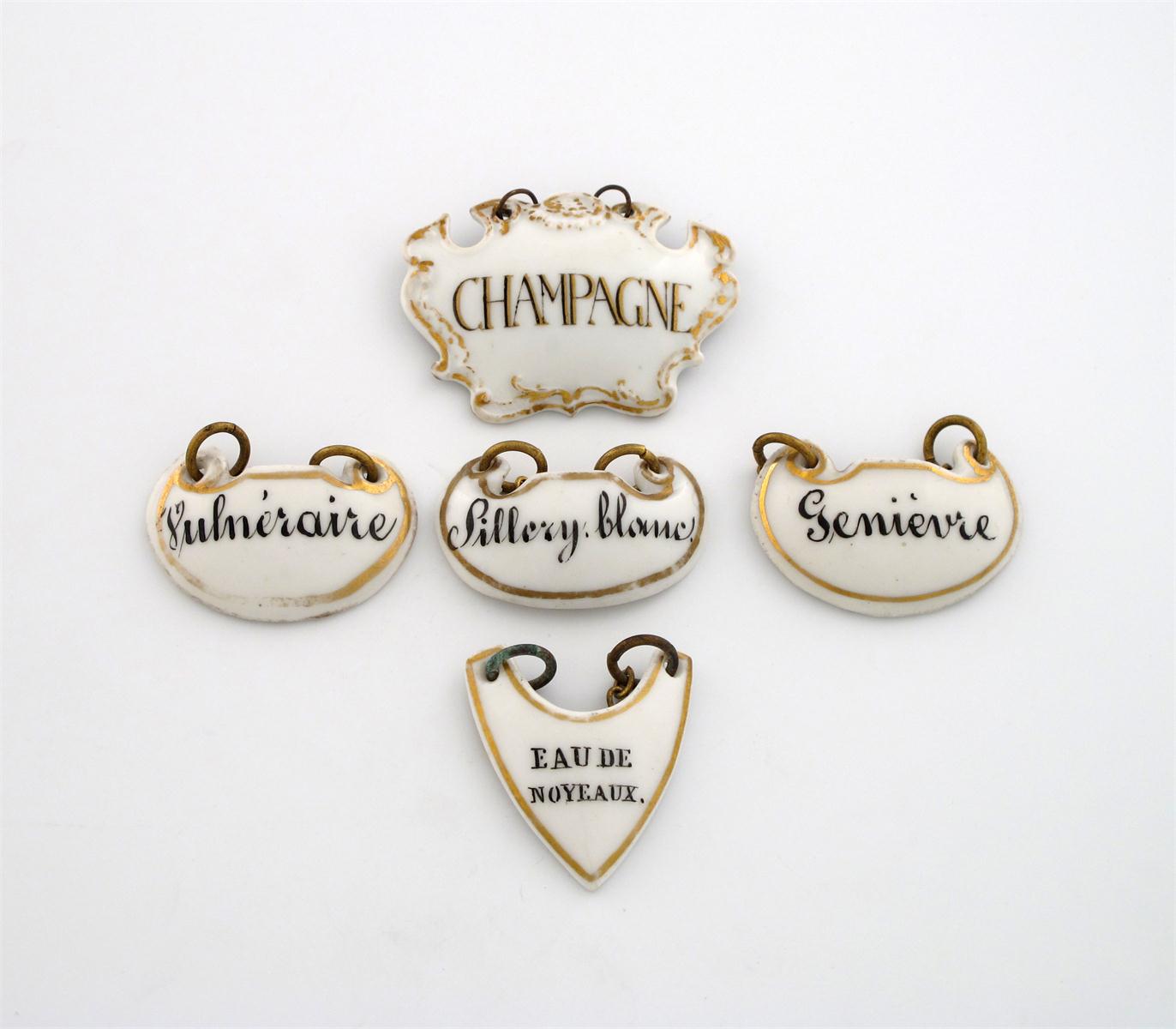 comprising: one of cartouche form, with a gilt scroll border and titled 'CHAMPAGNE', plus one of shield form 'EAU DE NOYEAUX', and a set of three of scroll form 'GENIEVRE', 'SILLERY BLANC', and 'VULNERAIRE'. (5)