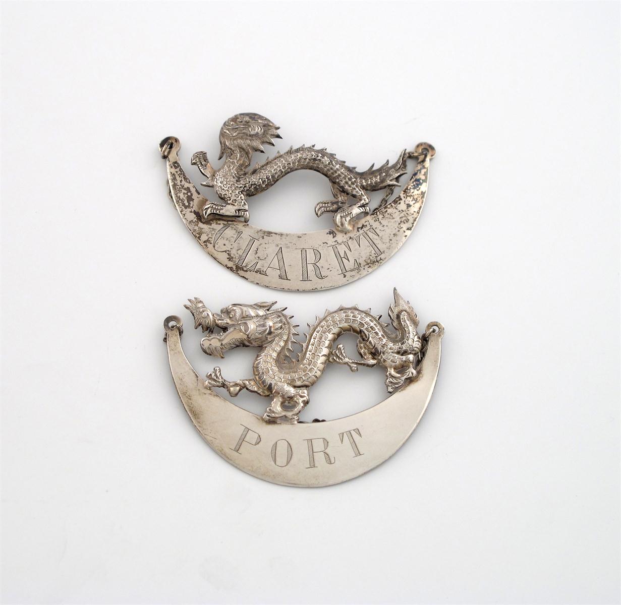 crescent form, mounted with a dragon pediment, incised 'PORT', plus another Chinese silver wine label, by KMS, of similar form, incised 'CLARET', length 6.2cm and 6.1cm. (2)