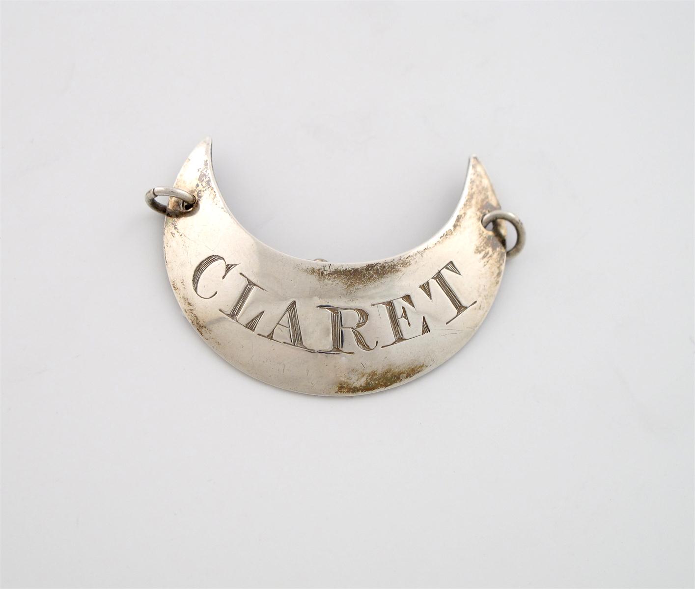 A George III silver wine label, by John Hutson, London 1792, plain crescent form, incised 'CLARET', length 4cm.