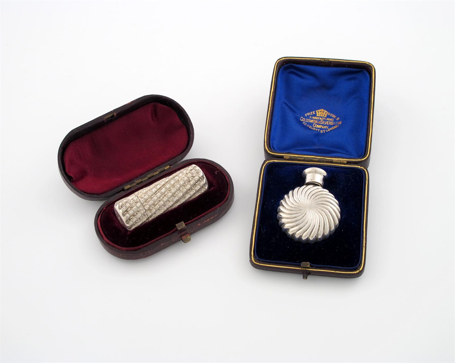 fluted cylindrical form, hinged cover, in a fitted case, height 5cm, plus a Victorian silver scent bottle, by S. Mordan and Co, London 1894, circular fluted form, in a fitted case. (2)