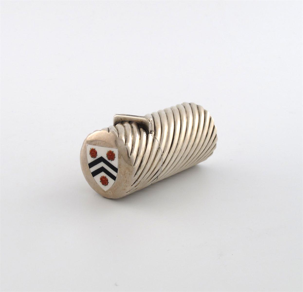fluted cylindrical form, the hinged cover enamelled with the arms of New College, Oxford, height 7.5cm.