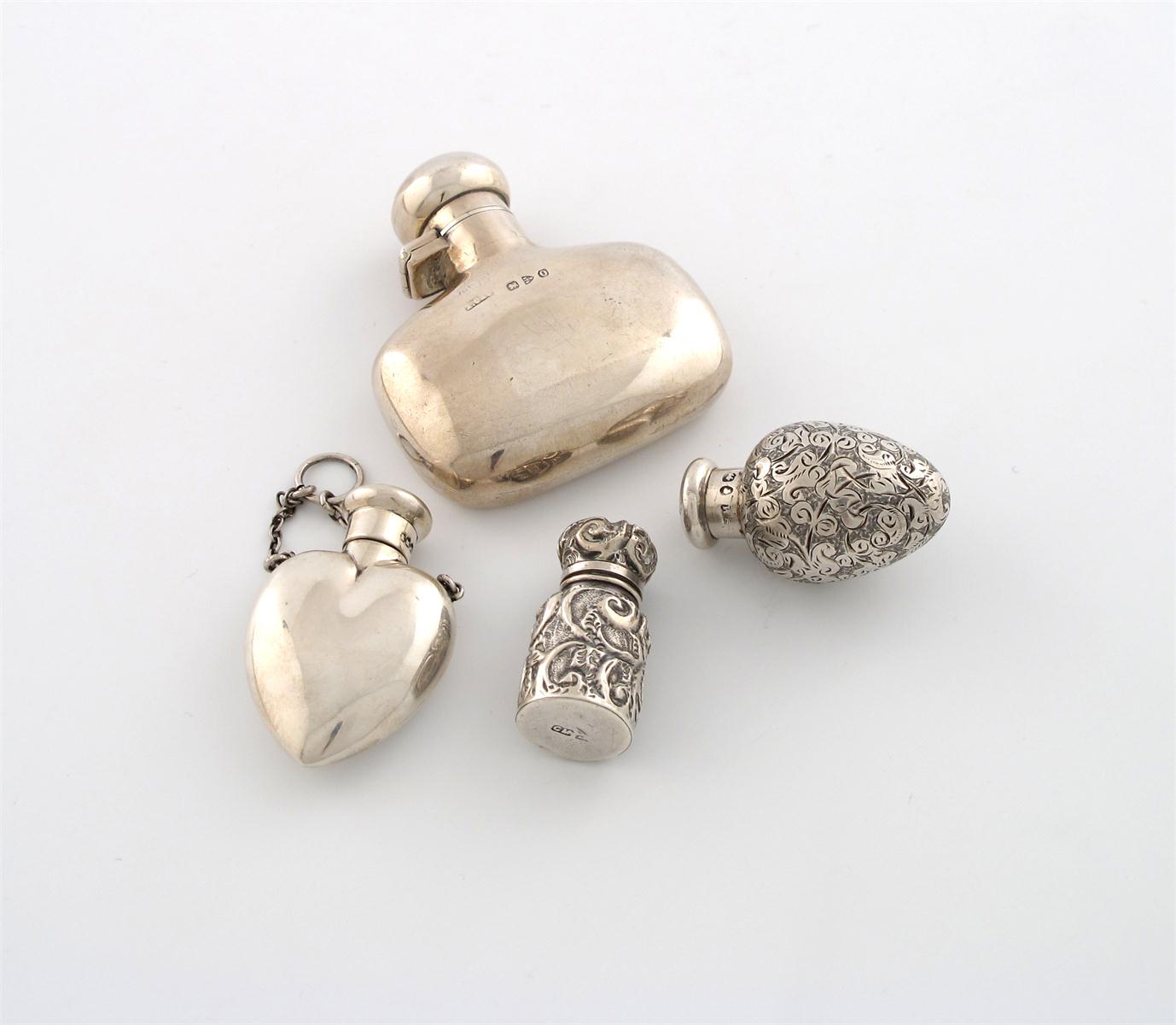 comprising: an S. Mordan bottle of egg form, engraved decoration, London 1887, the cover with a monogram, plus a heart shaped scent bottle by S. Mordan and Co, Chester 1905, and two other scent bottles, approx. weight 2.2oz. (4)