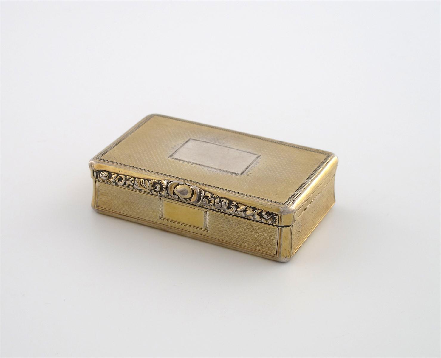 rectangular form, engine-turned decoration, the hinged cover with a foliate scroll thumb-piece, and with two vacant cartouches, length 7.8cm, approx. weight 4.1oz.