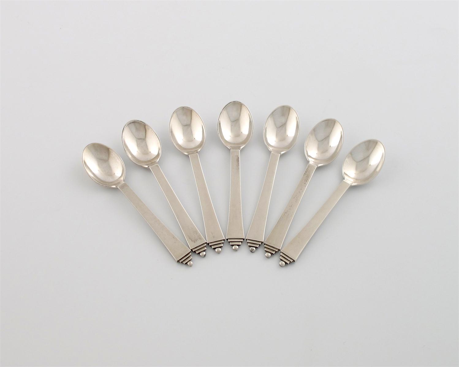 Designed by Harald Nielsen for Georg Jensen, a set of seven Danish silver Pyramid pattern coffee spoons,