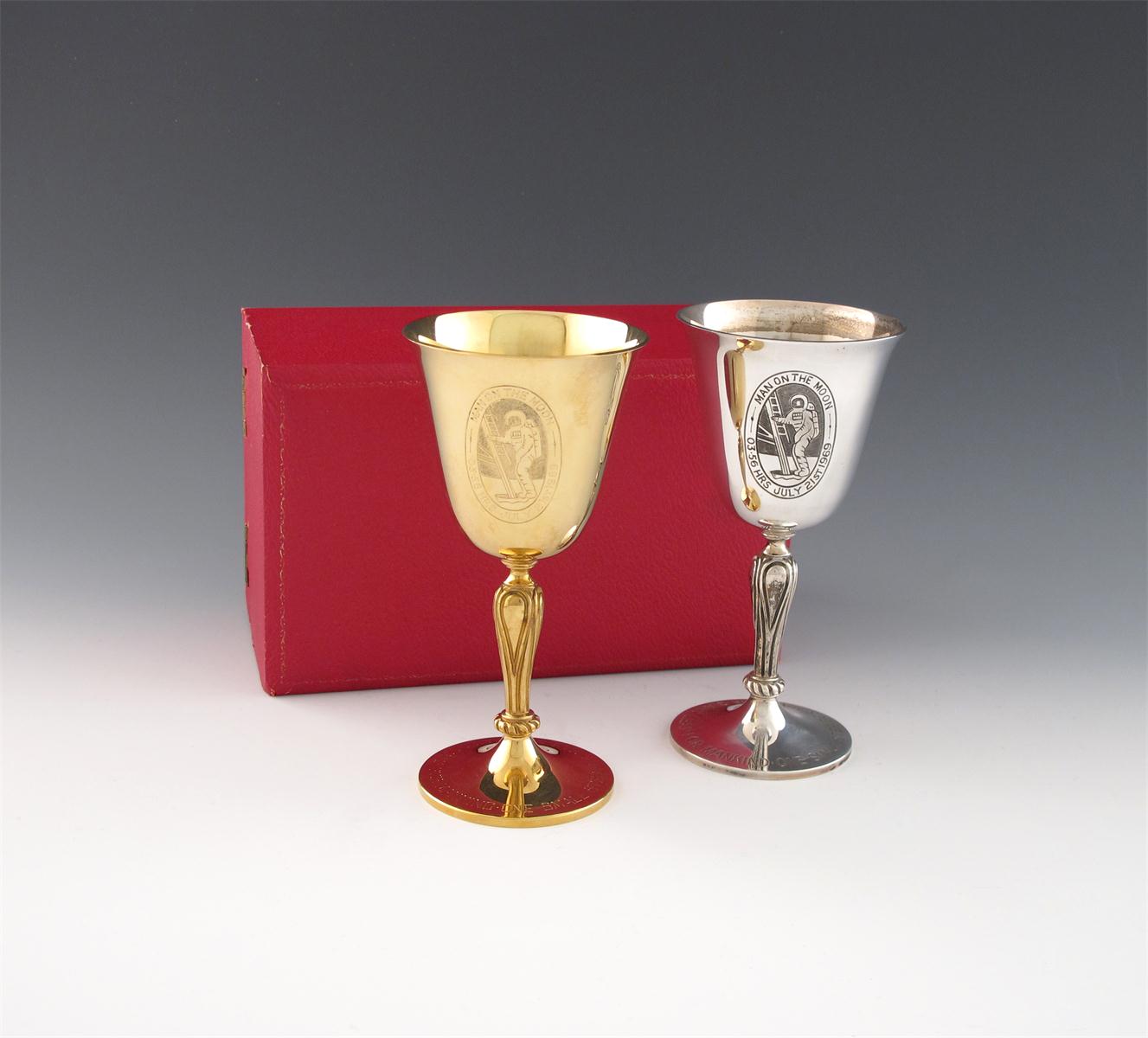tapering circular bowl, engraved with a scene of Neil Armstrong, and inscribed 'MAN ON THE MOON 03.56 HRS JULY 21st 1969,' on a baluster stem on a raised circular foot inscribed 'ONE SMALL STEP FOR MAN-ONE GIANT LEAP FOR MANKIND', height 13.3cm, approx. weight of gold 256.9g (8.1 troy oz), in a fitted case with a certificate, plus a matching silver goblet, approx. weight of silver 4oz.