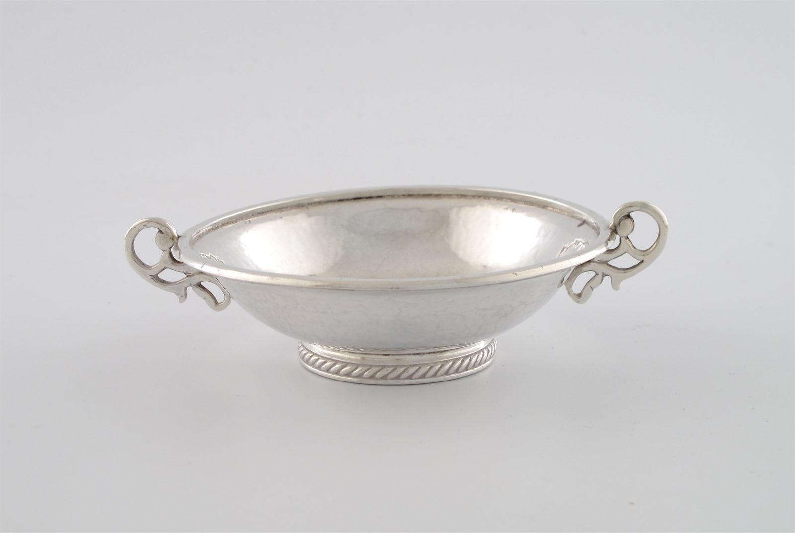 circular form, spot-hammered decoration, pierced scroll handles, on a circular foot with a rope-work border, diameter 10.2cm, approx. weight 3.8oz.